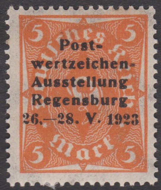 Als Werbemaßnahme zur "Postwertzeichen-Ausstellung Regensburg 26. - 28. V. 1923" wurden mehrere verschiedene gültige Postwertzeichen des Deutschen Reiches mit einem privaten, fünfzeiligen, schwarzen Aufdruck versehen!
