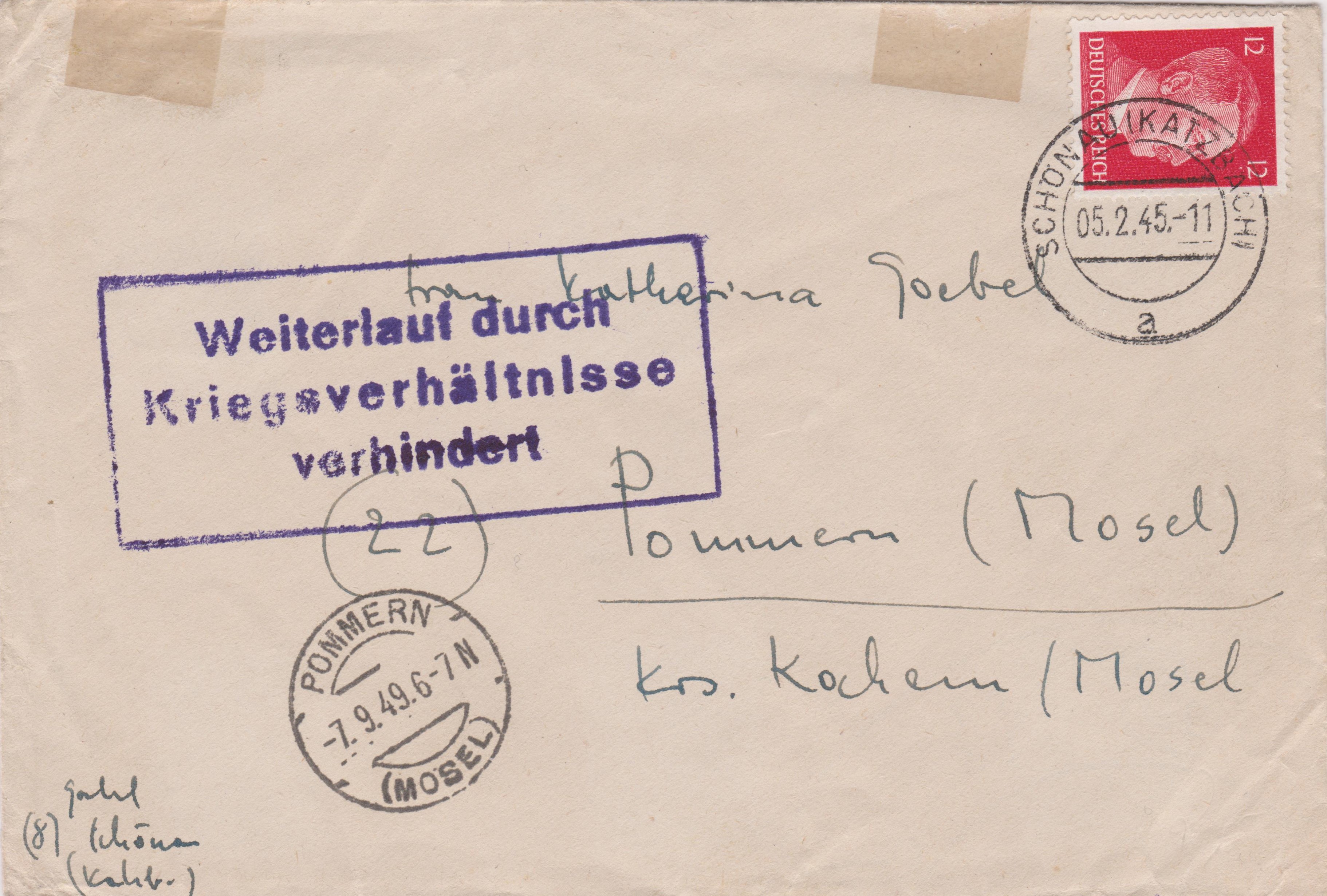 Dieser nach "Pommern(Mosel)" adressierte Brief wurde am 05.02.1945 aufgegeben in "SCHÖNAU(KATZBACH)":