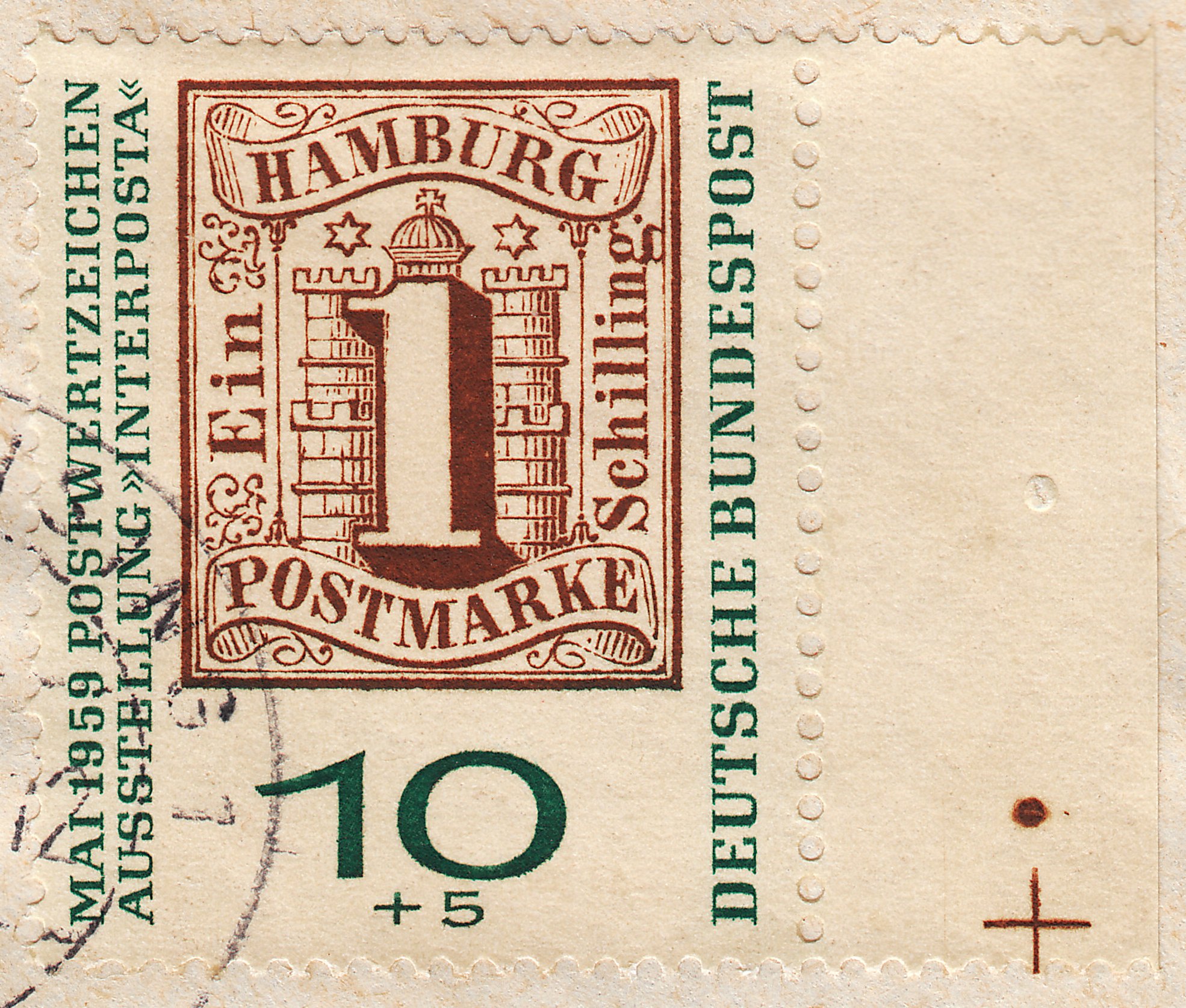 Hier ein Nadelpunkt sowie Passerkreuz am rechten Rand bei einer MiNr. 310 a: