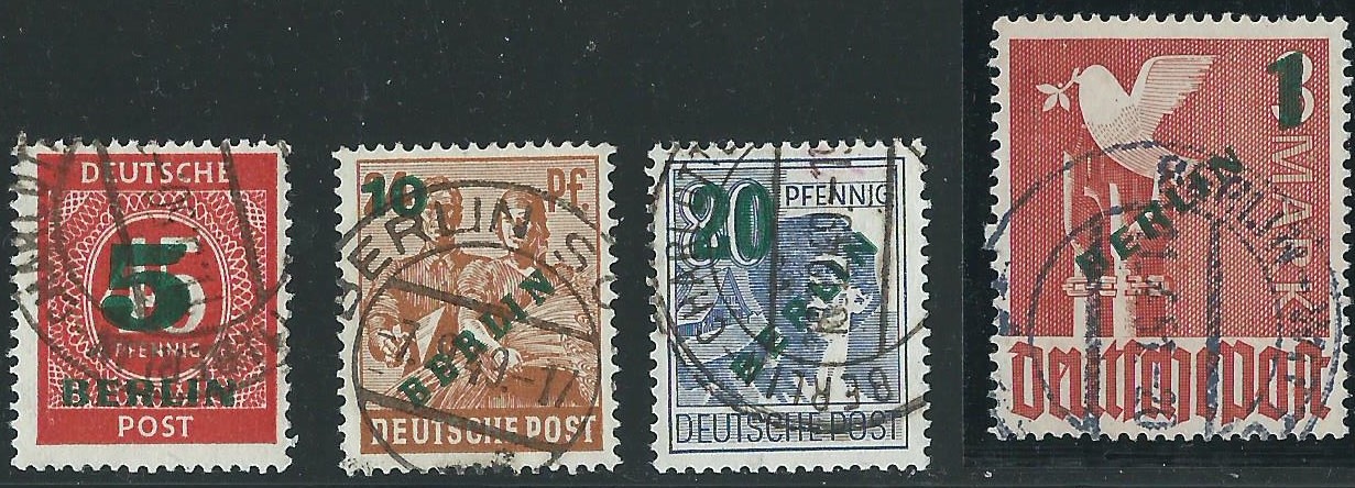 in einem online-Angebot einer Briefmarkenverkaufsseite ist mir der hier gezeigte Satz aufgefallen: Berlin Grünaufdruck Mi.-Nr. 64 – 67 schön gestempelt, Ausruf 6 € plus Porto. Und irgendwie konnte ich es mir nicht verkneifen, hier zuzuschlagen. Seht ihr, warum?