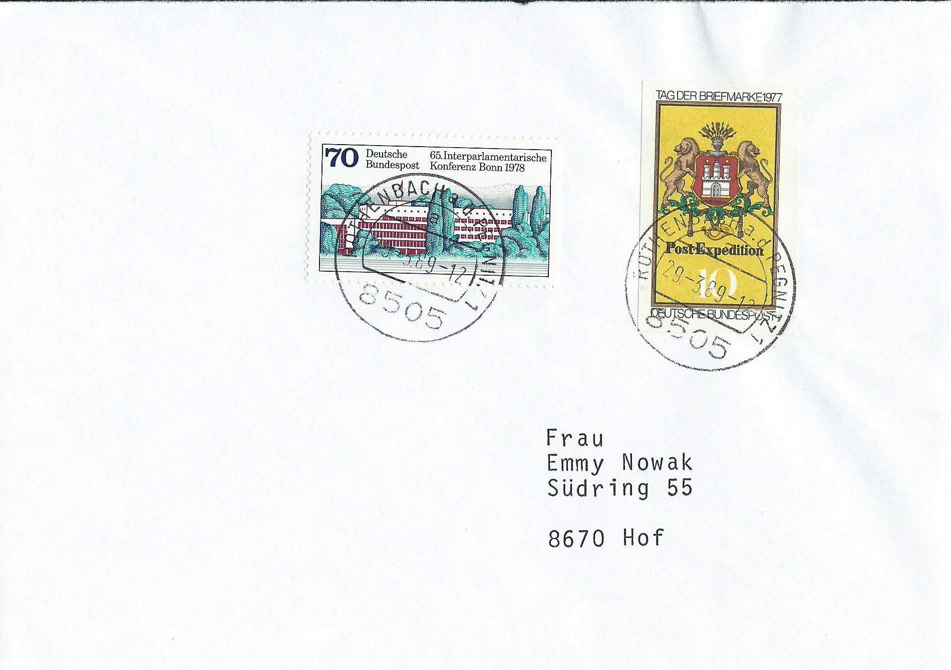 Hier haben wir einen auf den ersten Blick unscheinbaren Brief mit 2 Sondermarken als Frankatur. Gestempelt wurde am 29.3.89 in Röthenbach an der Pegnitz, also in der Portoperiode 80 Pf für einen Standartbrief.