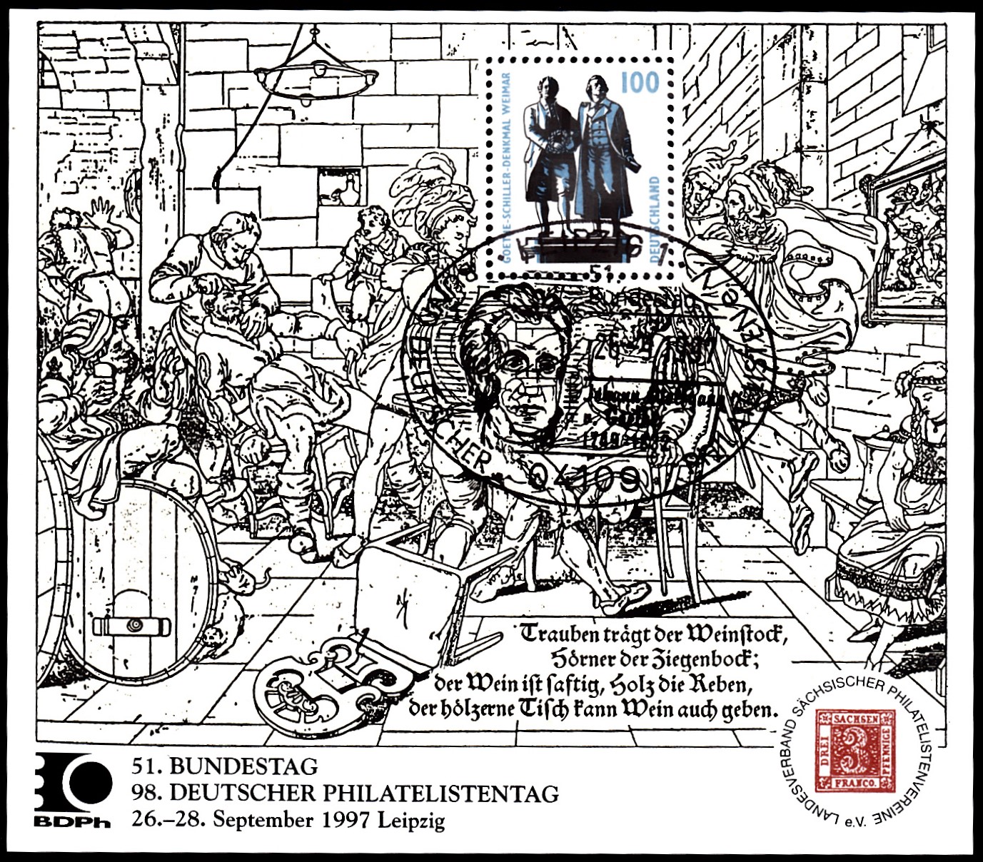 Hier zu wurde geschrieben: "Offizieller Ausstellungsblock, herausgegeben zum 51. Bundestag des Bundes Deutscher Philatelisten e.V. und zum 98. Deutschen Philatelistentag, die vom 26.-28. September 1997 in Leipzig begangen wurden. Der Blockenthält die 100-Pfg.-Freimarke "Goethe-Schiller-Denkmal Weimar aus der Serie "Sehenswürdigkeiten". ...."