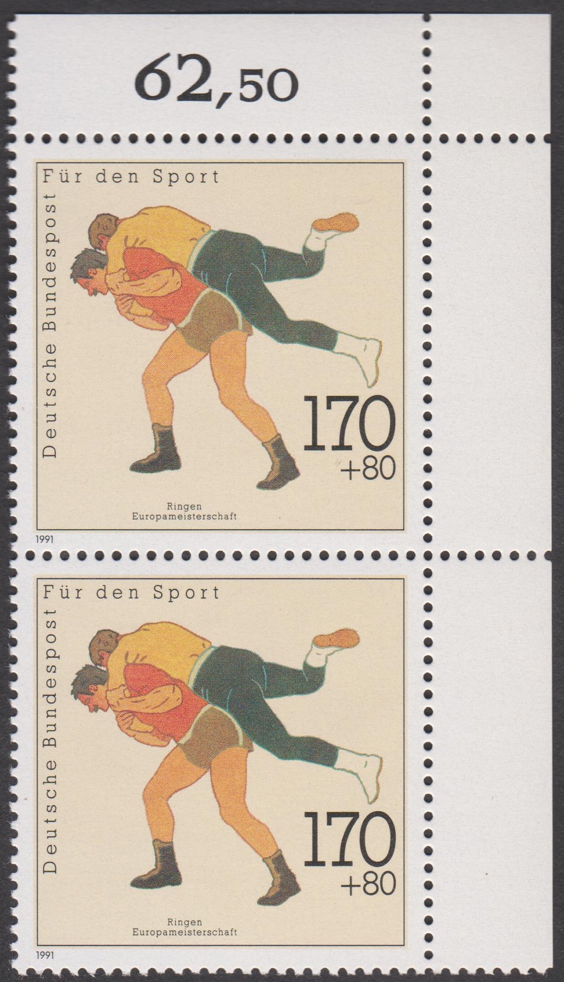 Dieses ETB 10/1991 zeigt bei der Bund MiNr. 1502 den bei Schantl als MiNr. 1502 f 10 katalogisierten Plattenfehler "grüner Fleck im Unterarm des roten Ringers":