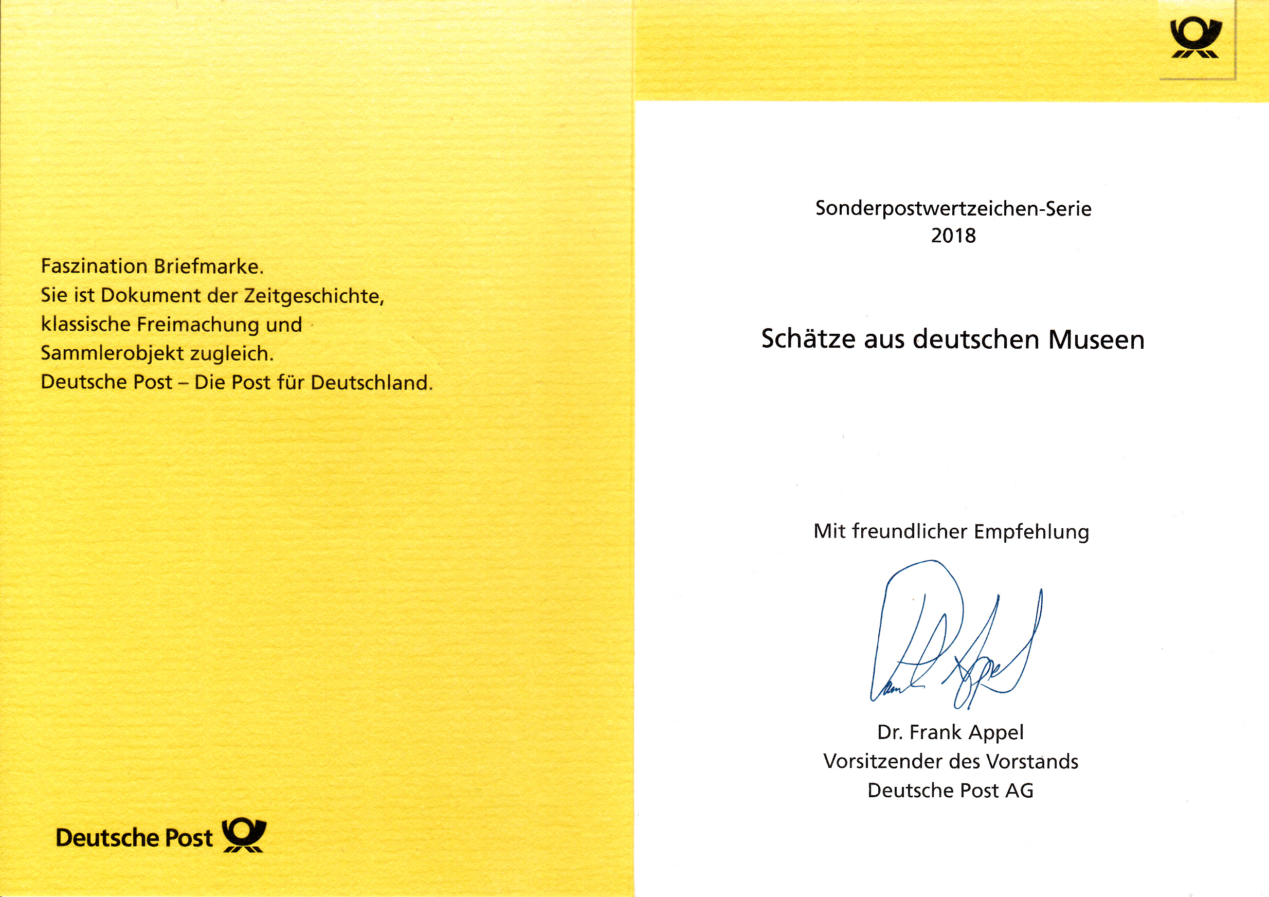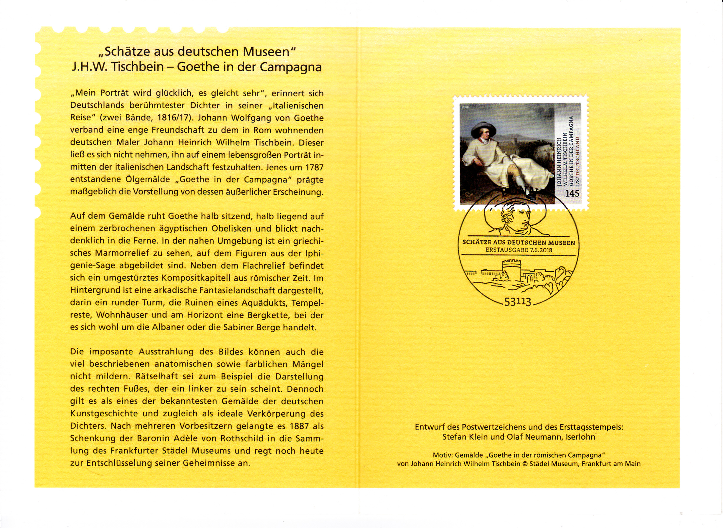 Klappkarte des Vorstandsvorsitzenden der Deutschen Post AG mit der Marke aus der Serie Schätze aus deutschen Museen mit dem Bild "Goethe in der Campagna" nach dem Gemälde von Johann Heinrich Wilhelm Tischbein und dem Ersttagsonderstempel aus Bonn.
