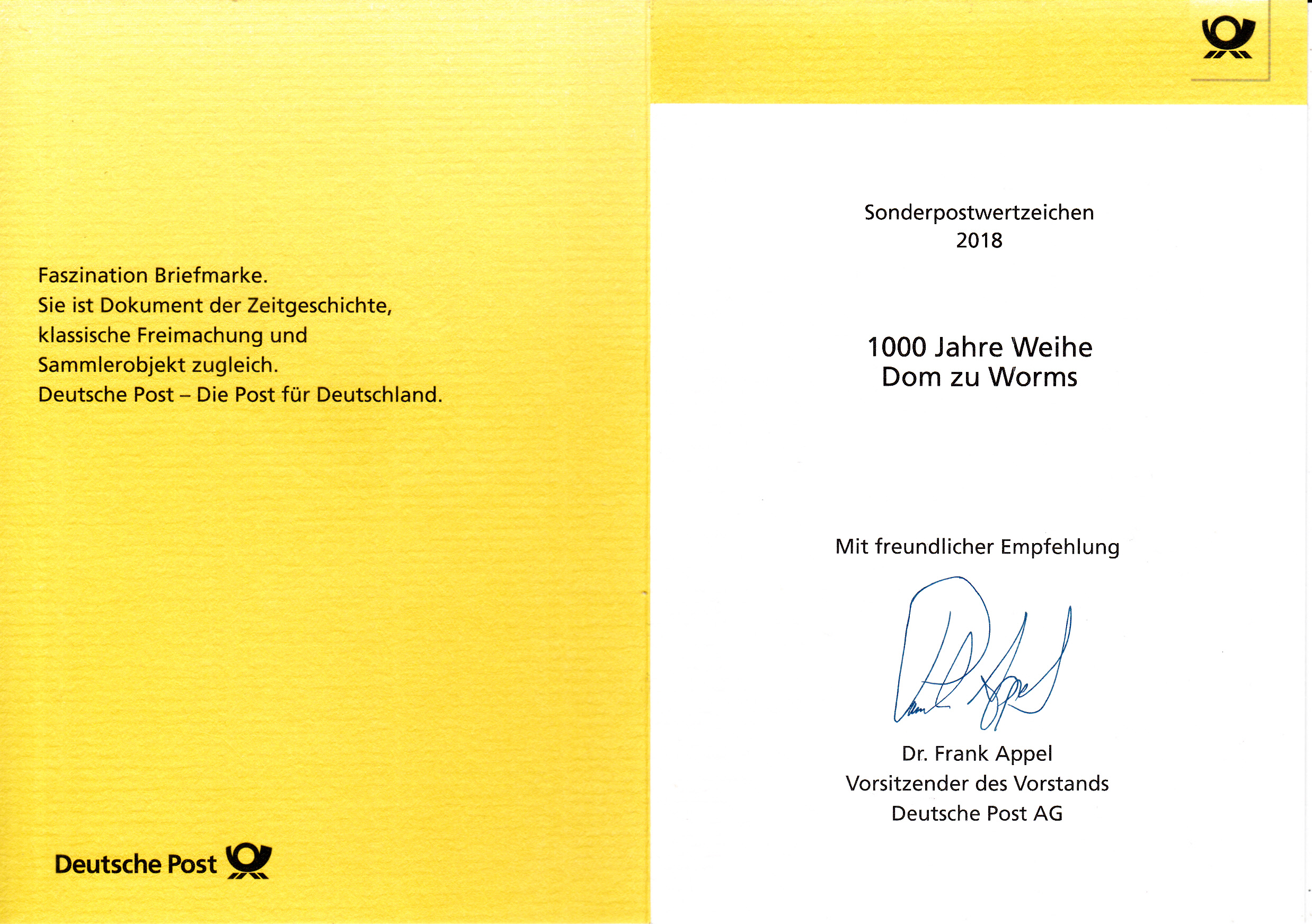 Klappkarte des Vorstandsvorsitzenden der Deutschen Post AG mit der Marke "1000. Jahrestag der Weihe des Doms zu Worms" und dem Ersttagsonderstempel aus Bonn.