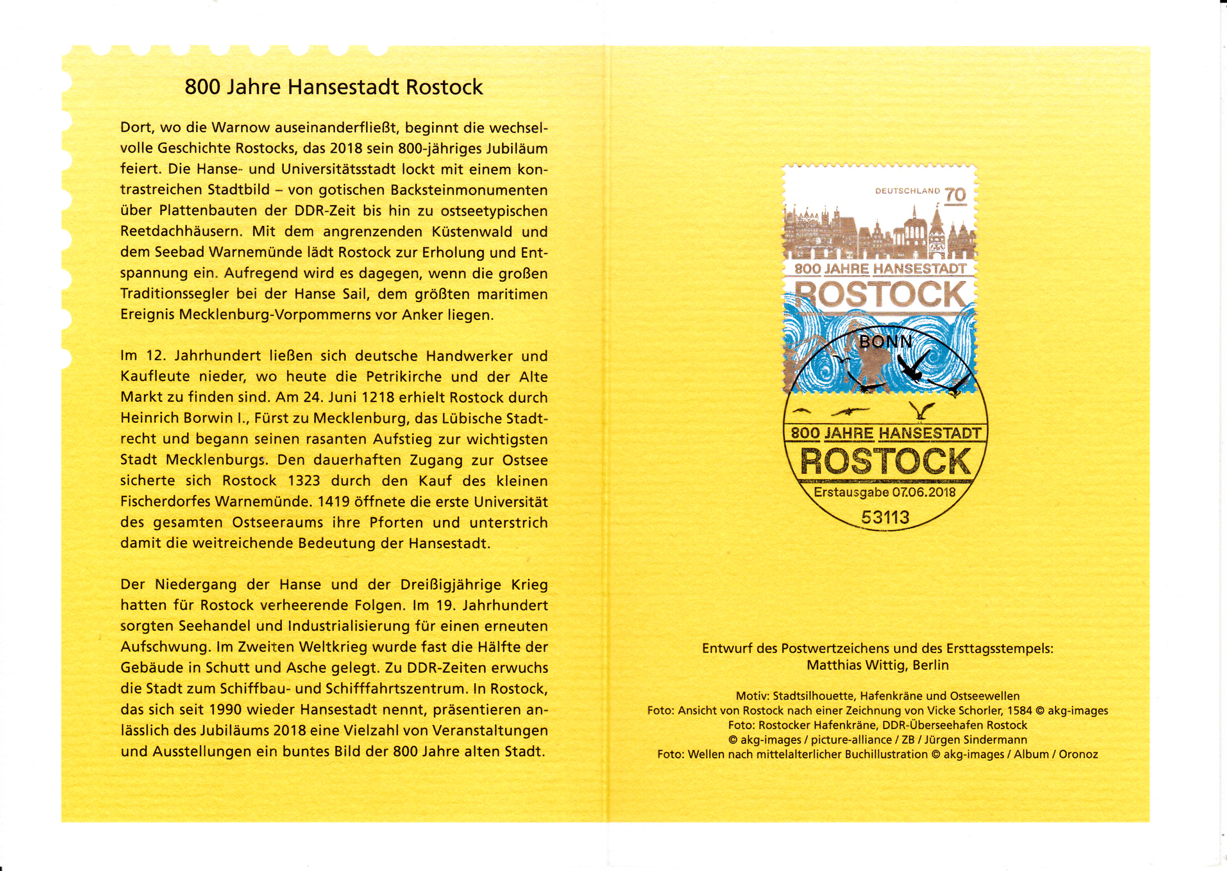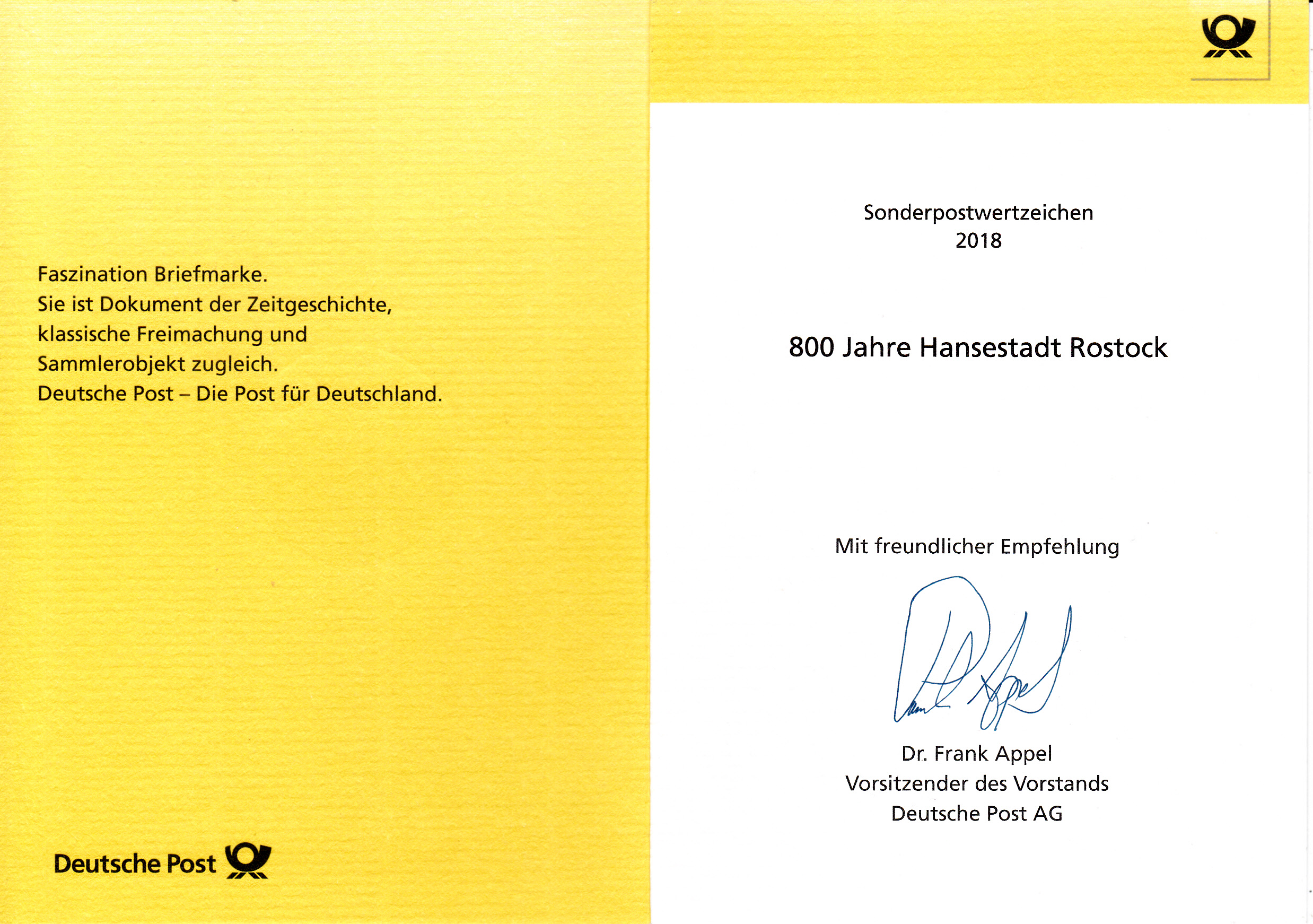 Klappkarte des Vorstandsvorsitzenden der Deutschen Post AG mit der Marke zum Jubiläum "800 Jahre Hansestadt Rostock" und dem Ersttagsonderstempel aus Bonn.