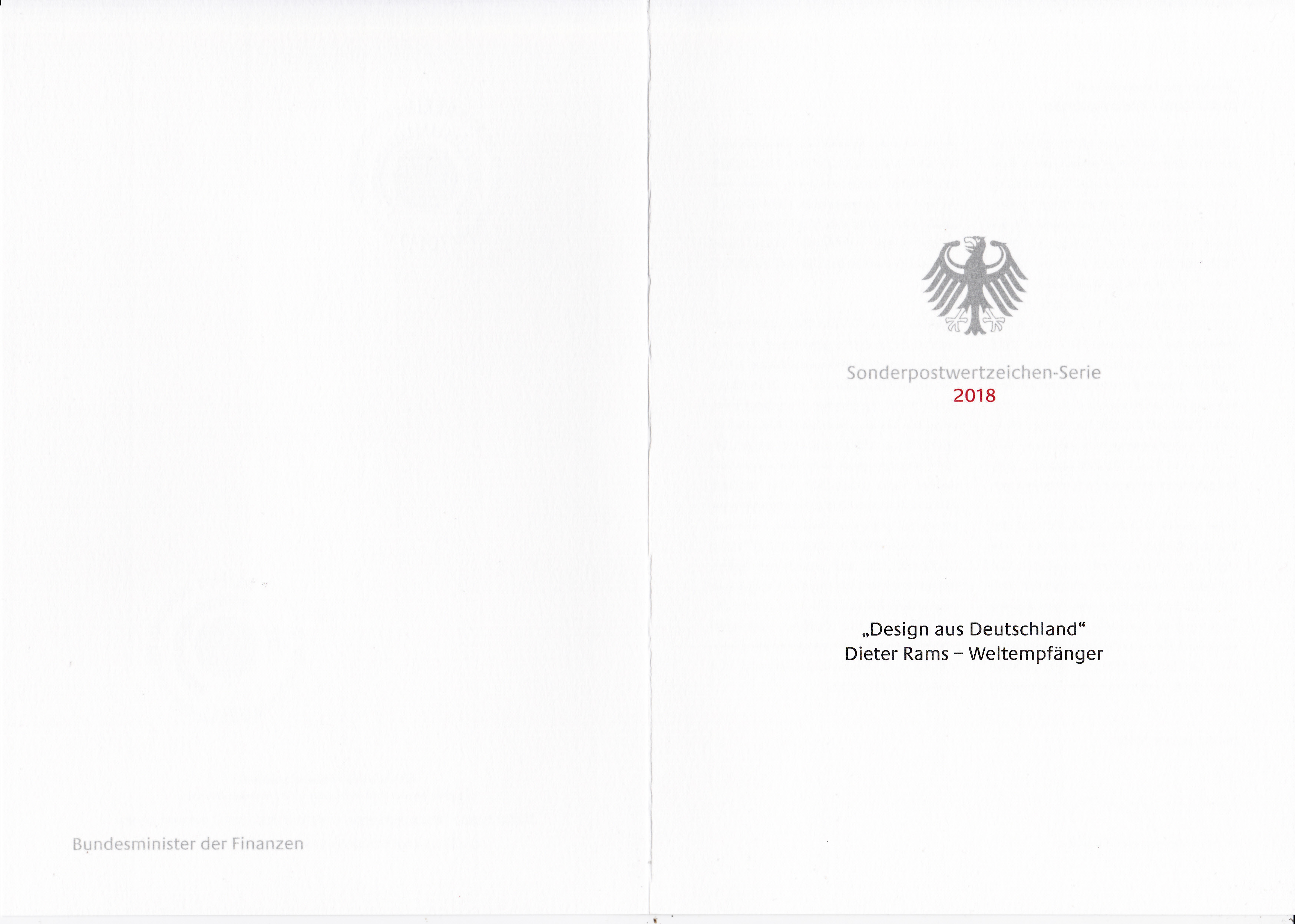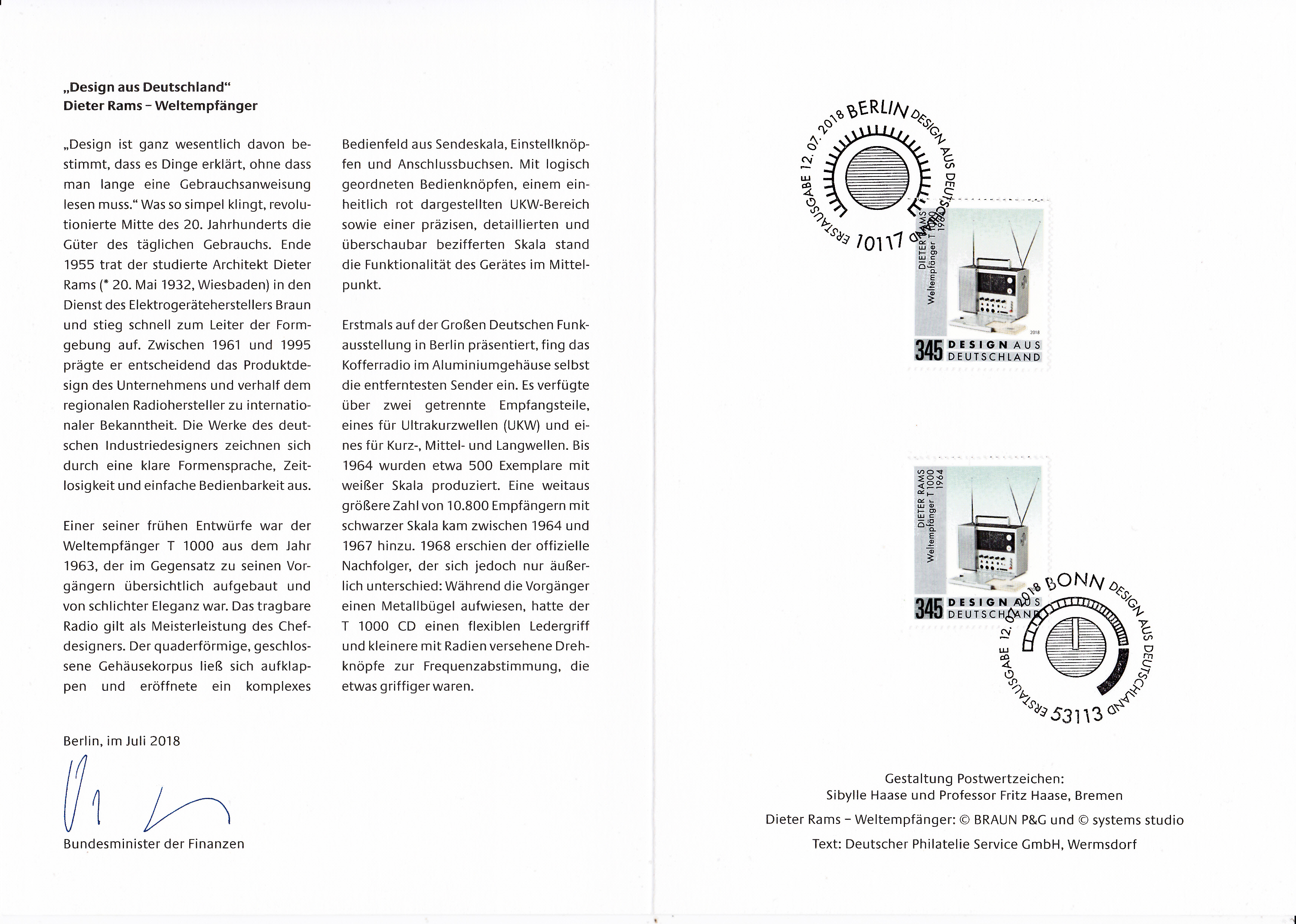 Ministerkarte des Finanzministers mit der Marke aus der Serie "Design in Deutschland" (MiNr 3400) mit einem Weltempfänger T 1000 (1964) von Dieter Rams mit den beiden Ersttagsonderstempel Bonn und Berlin.