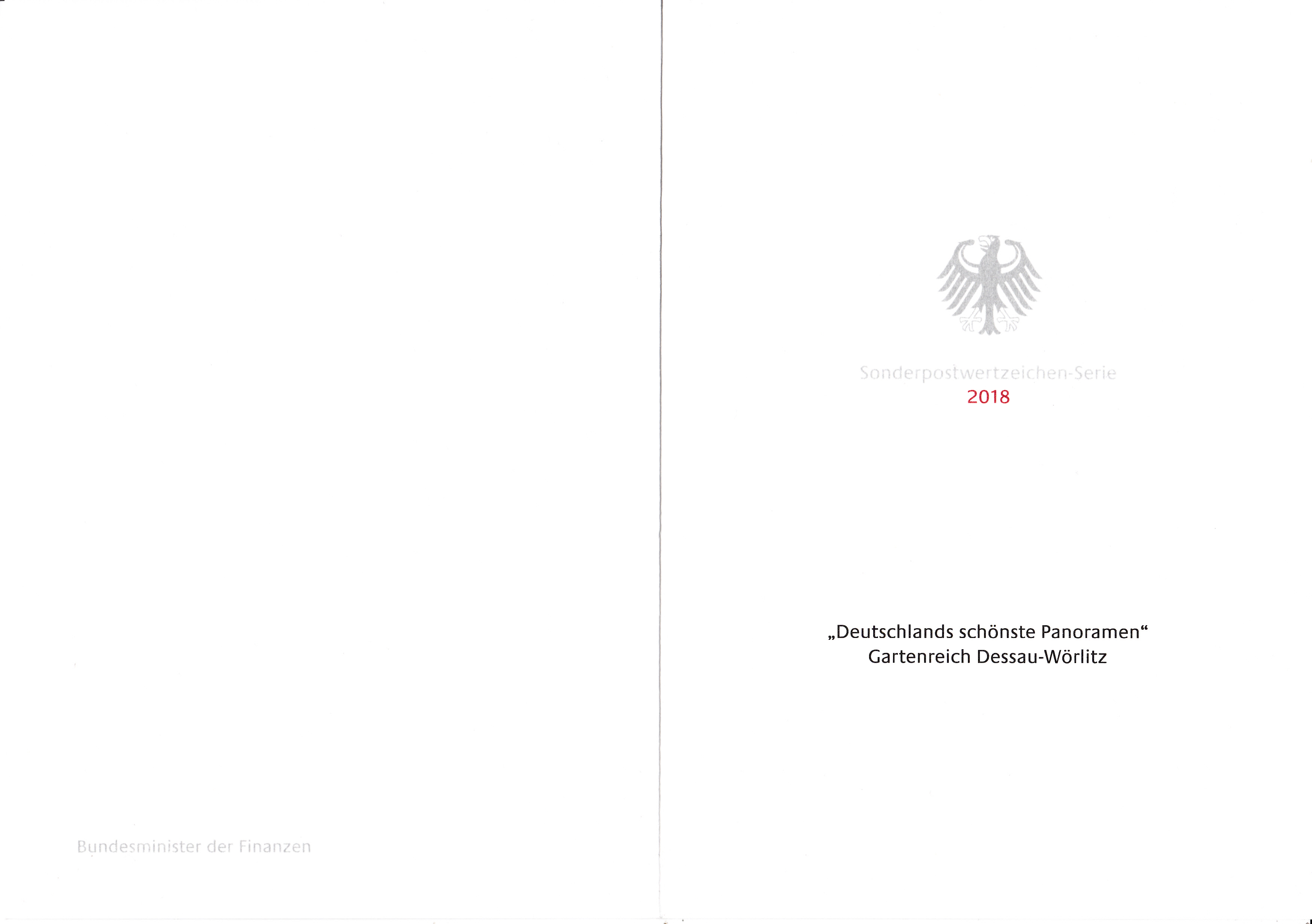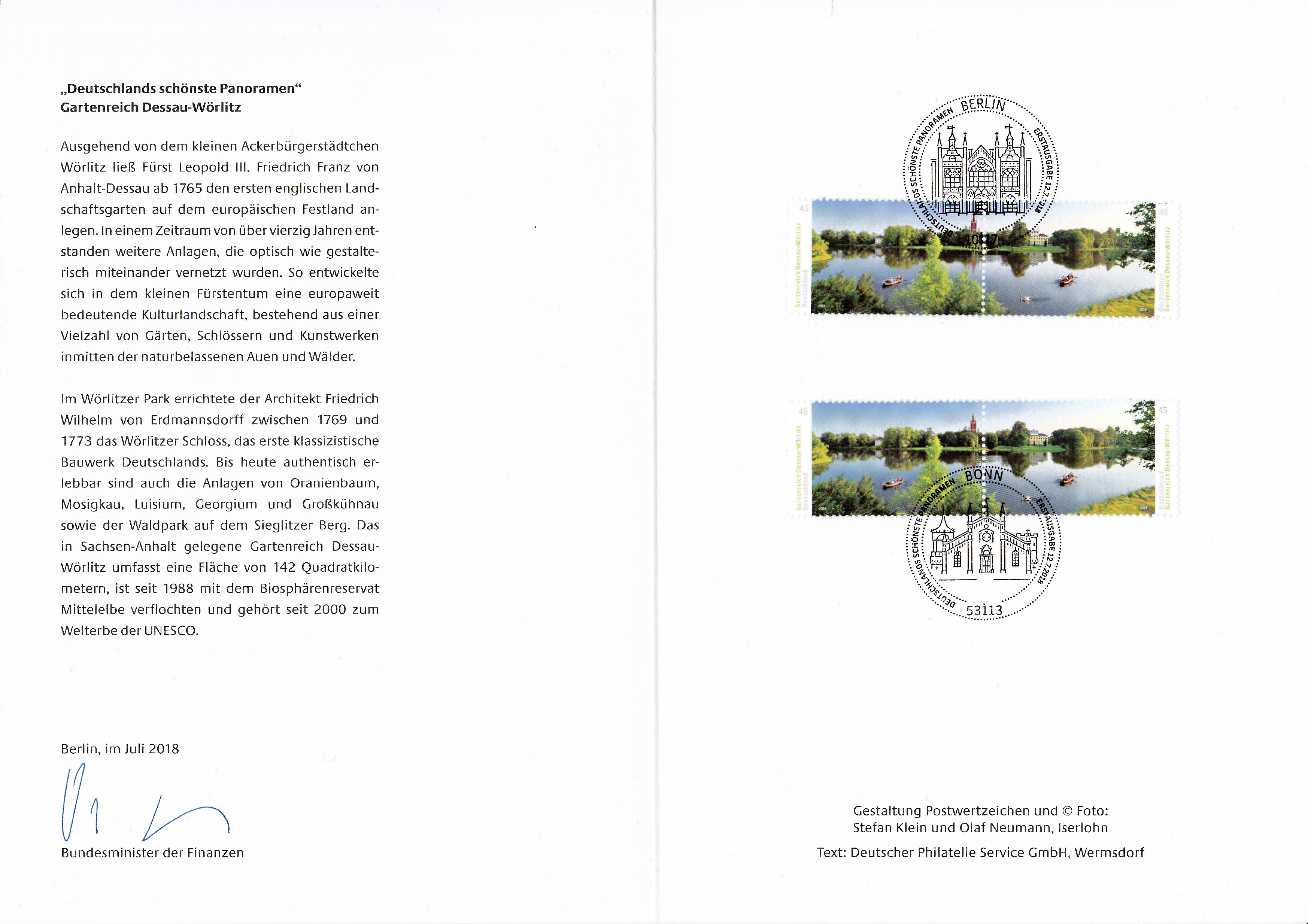 Ministerkarte des Finanzministers mit zwei Zusammendrucken aus der Serie "Deutschlands schönste Panoramen" mit dem Motiv "Gartenreich Dessau-Wörlitz: Wörlitzer See mit Synagoge, Kirche St. Petri und Schloss" und mit den beiden Ersttagsonderstempel Bonn und Berlin.