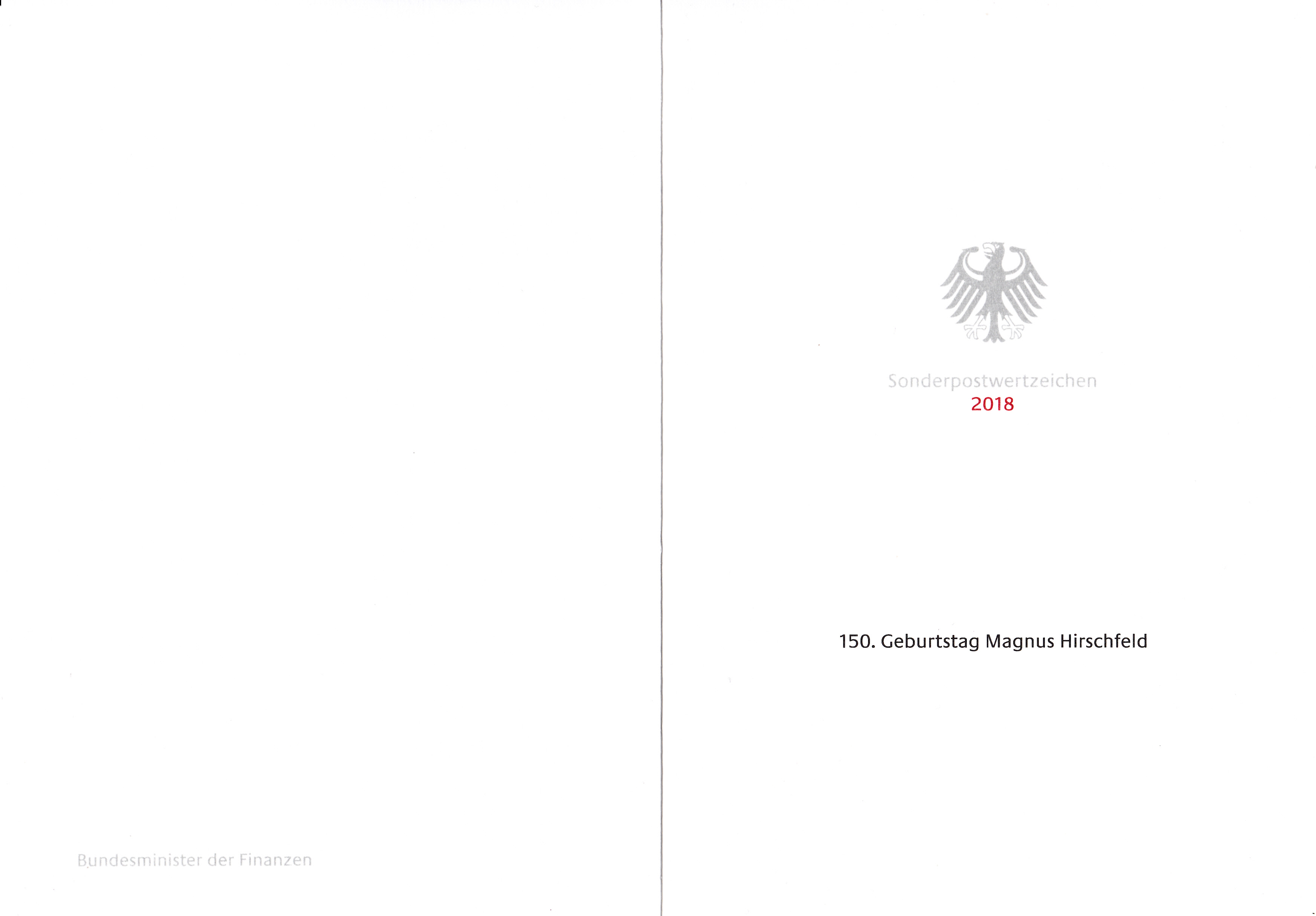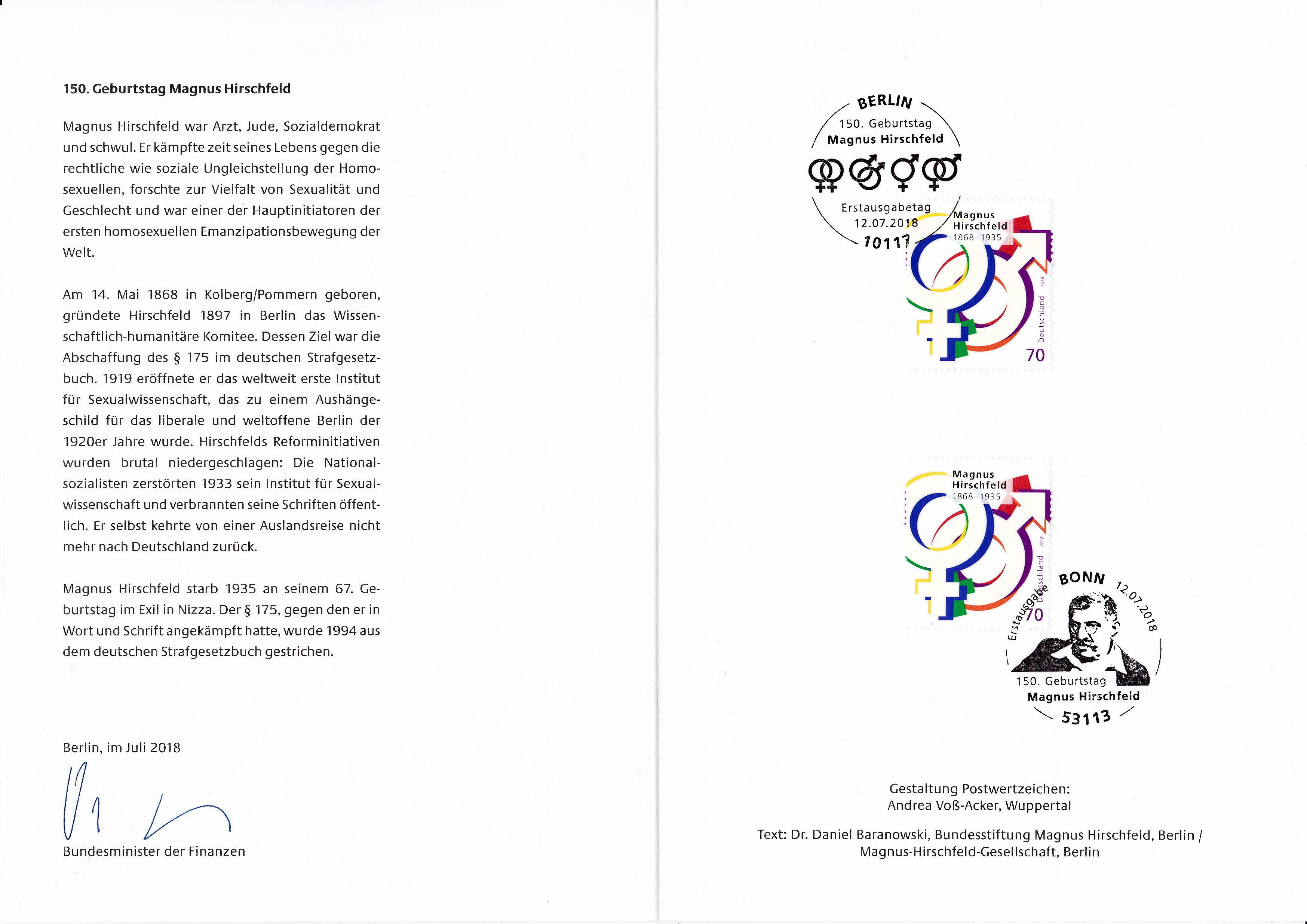 Ministerkarte mit zwei Marken zum 150. Geburtstag von Magnus Hirschfeld (1868-1935, Arzt und Sexualforscher) eine mit dem Stempel Berlin und die zweite mit dem Stempel Bonn gestempelt.