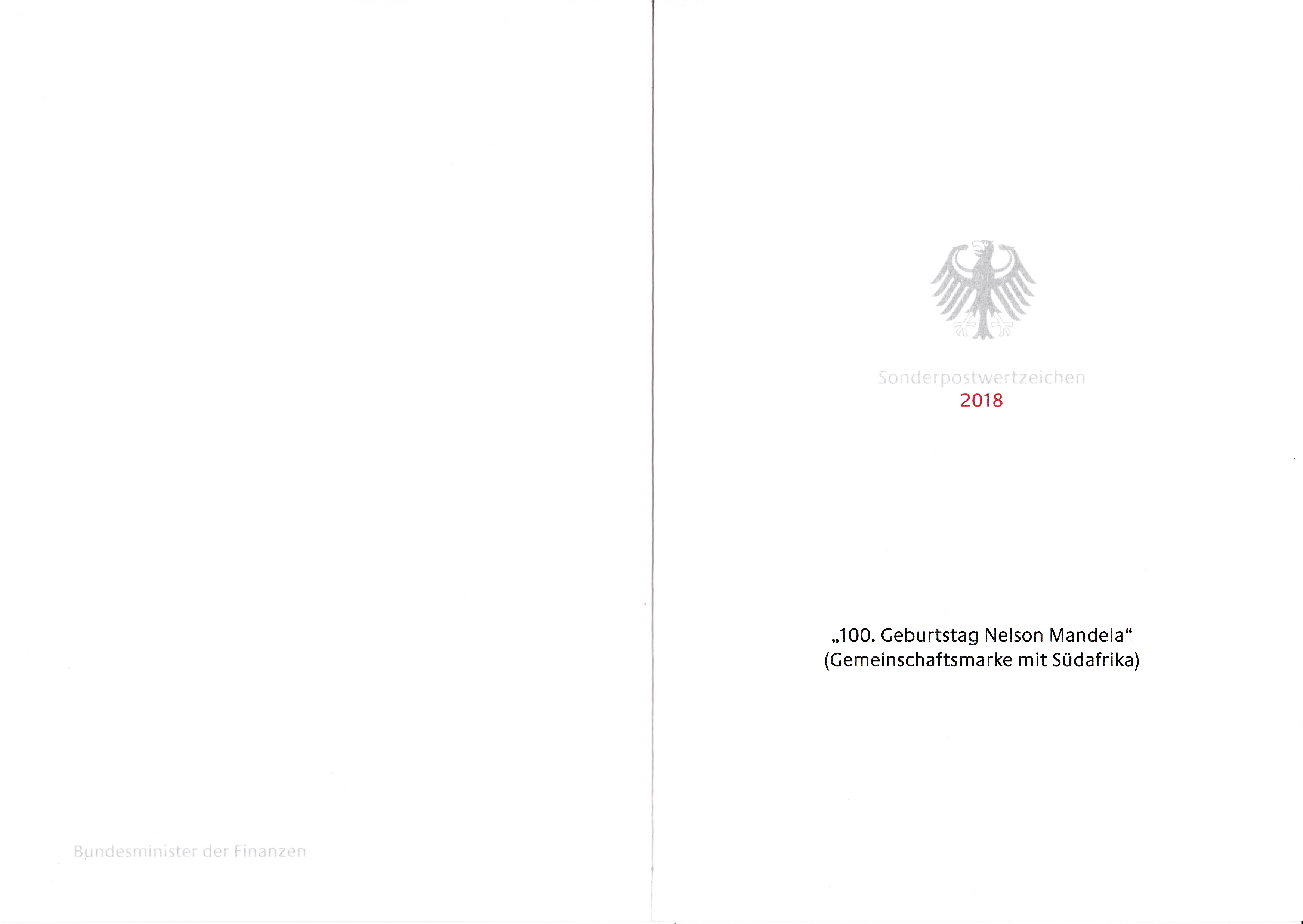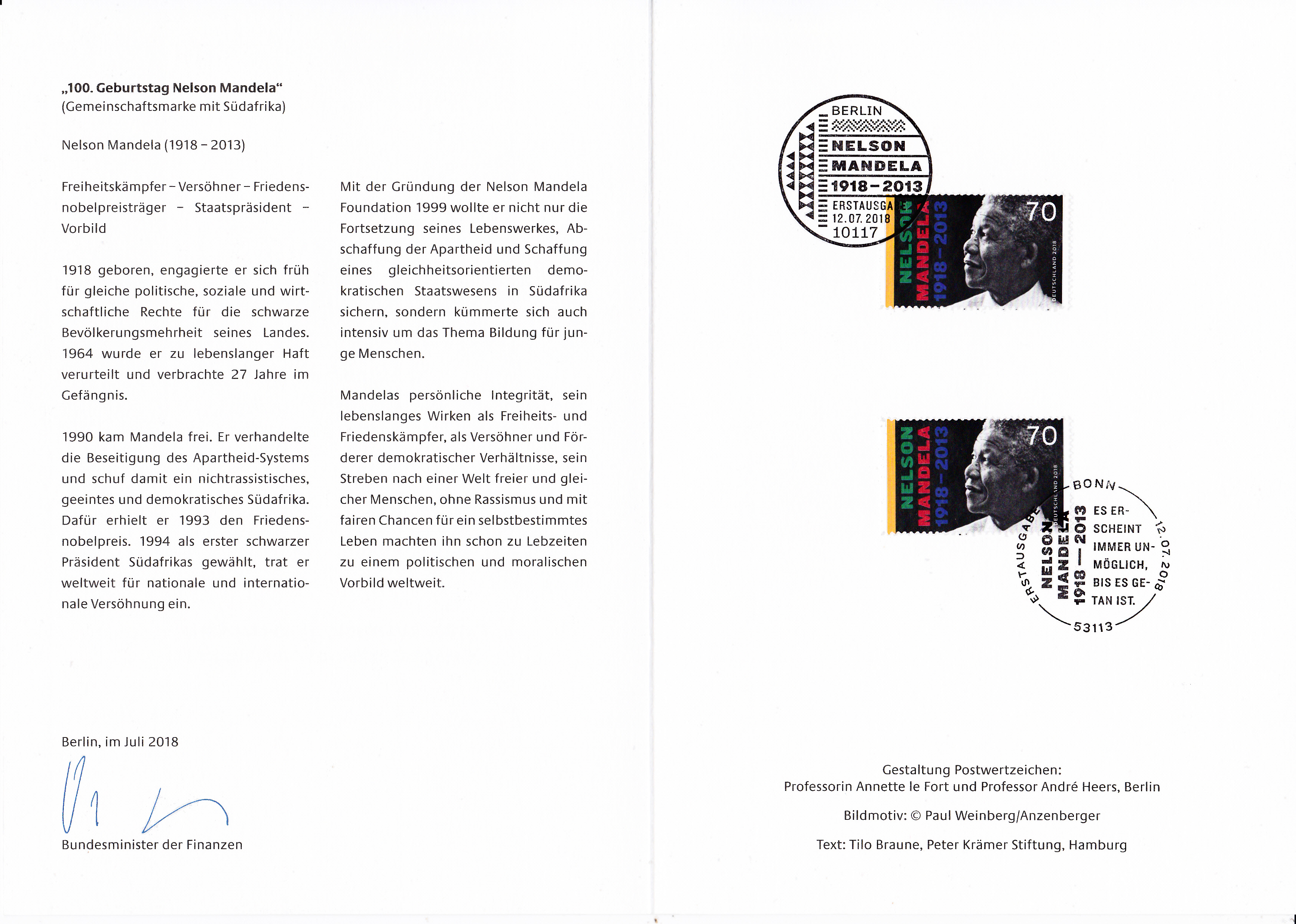 Ministerkarte mit zwei Marken zum 100. Geburtstag von Nelson Mandela eine mit dem Stempel Berlin und die zweite mit dem Stempel Bonn gestempelt.