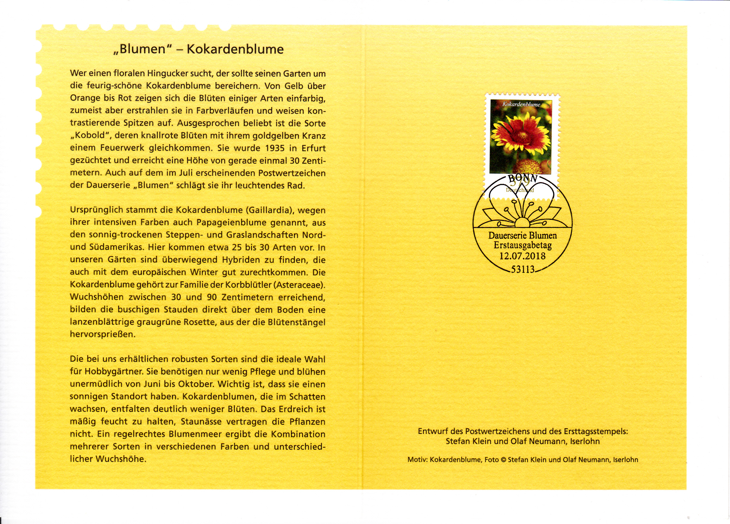 Klappkarte des Vorstandsvorsitzenden der Deutschen Post AG mit der Marke zu 379 Cent der Dauerserie "Blumen" (MiNr 3399) mit der Abbildung einer Großblumigen Kokardenblume (Gaillardia grandiflora) und dem Ersttagsonderstempel aus Bonn.