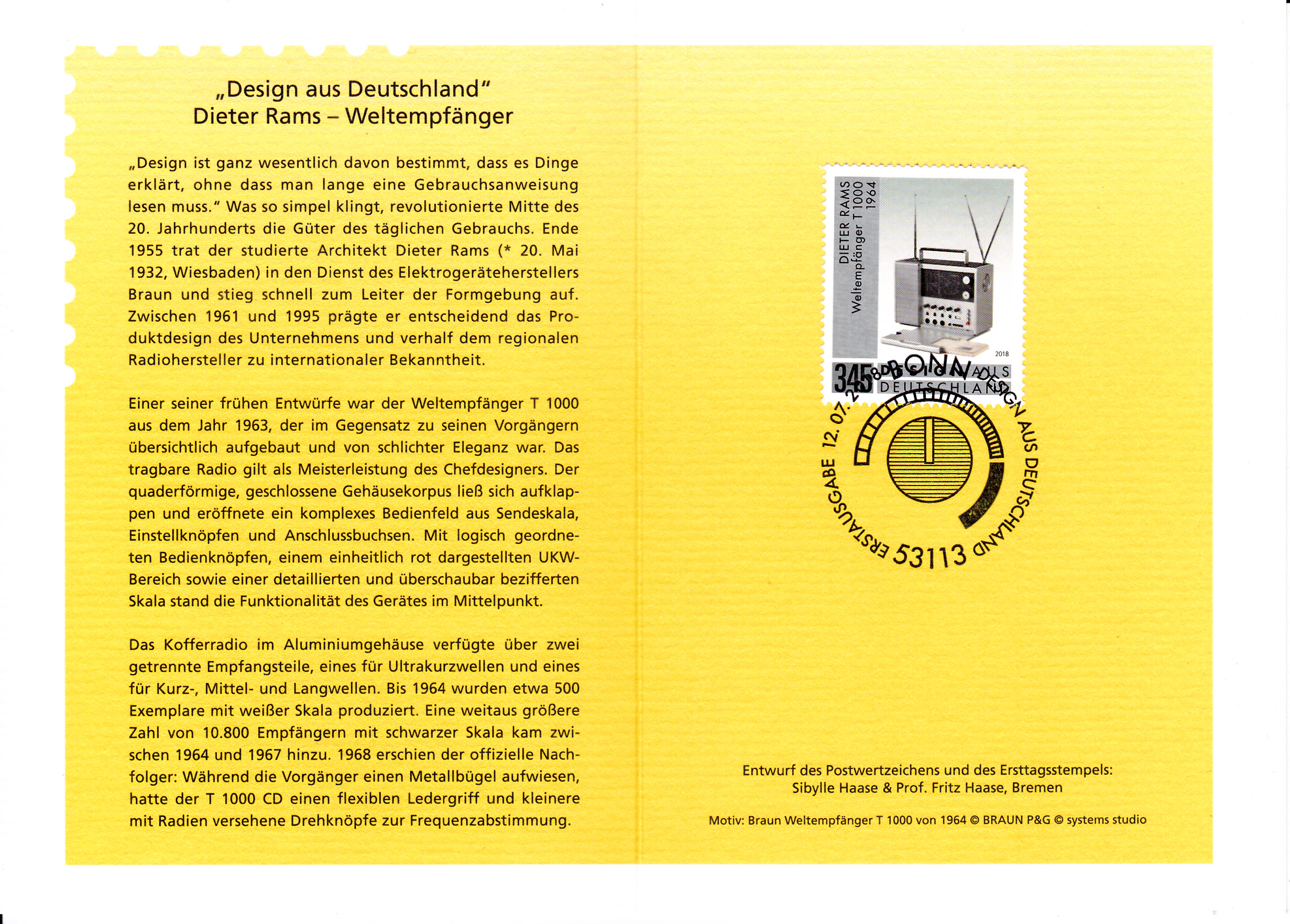 Klappkarte des Vorstandsvorsitzenden der Deutschen Post AG mit der Marke aus der Serie "Design in Deutschland" (MiNr 3400) mit einem Weltempfänger T 1000 (1964) von Dieter Rams und dem Ersttagsonderstempel aus Bonn.