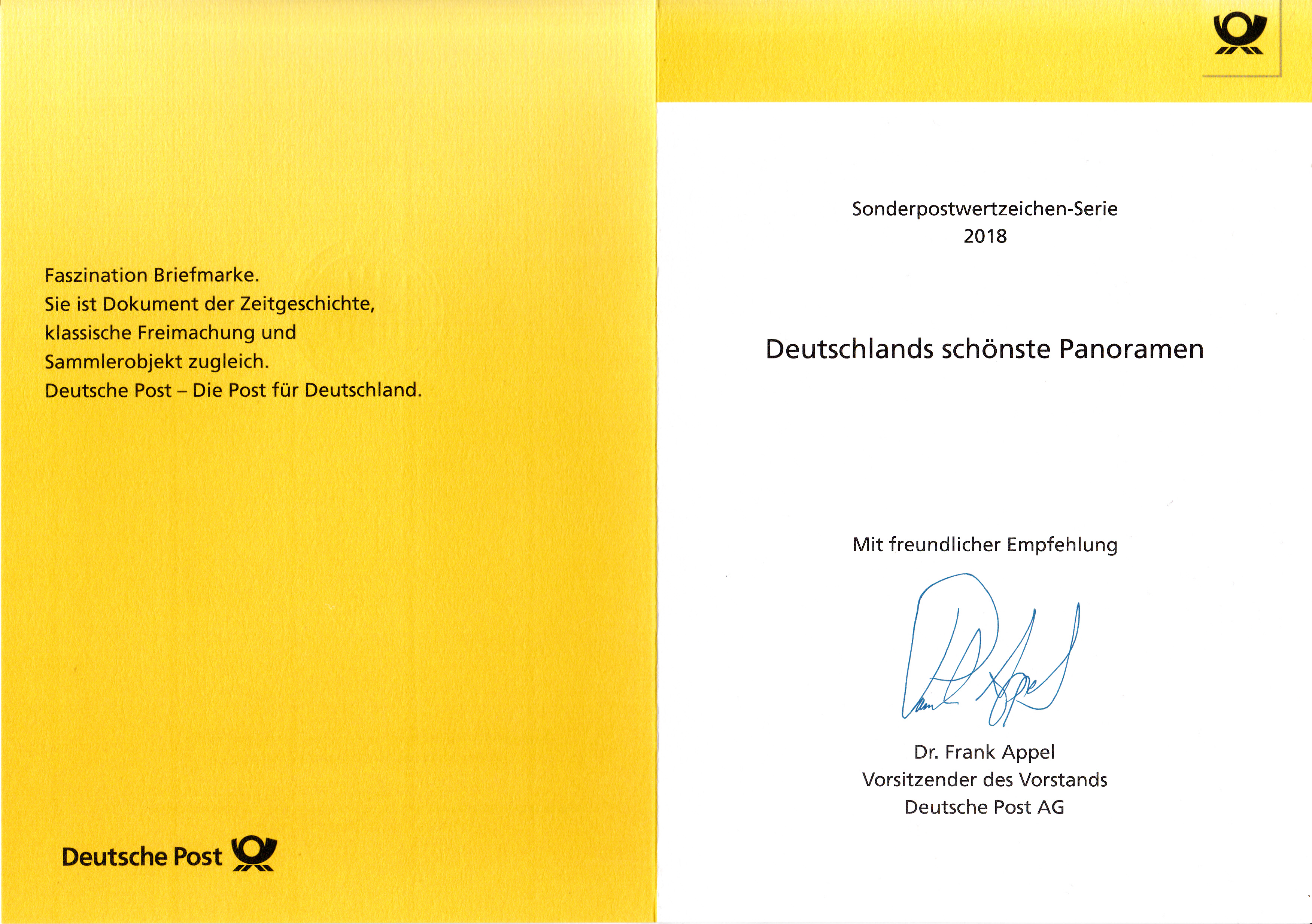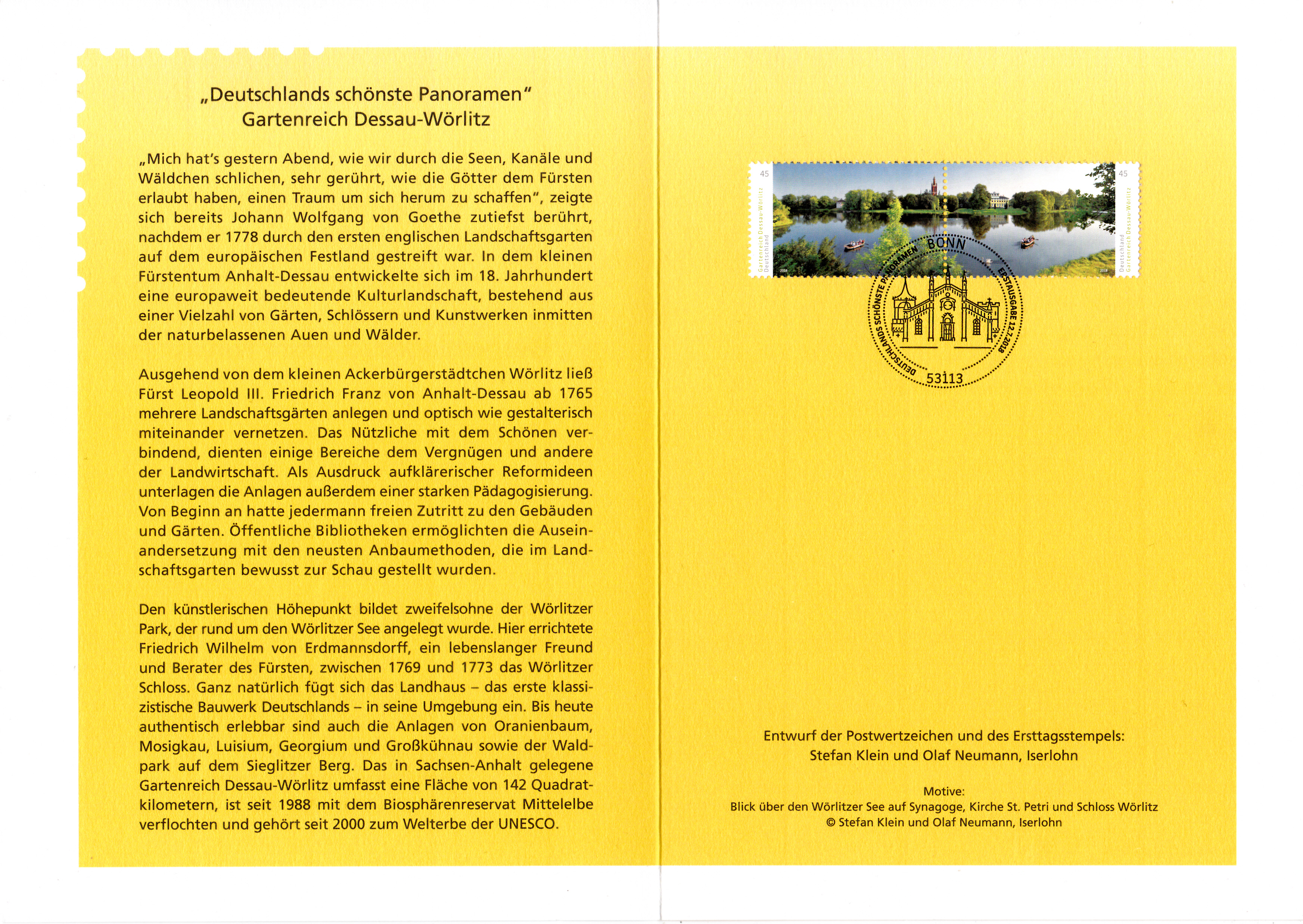 Klappkarte des Vorstandsvorsitzenden der Deutschen Post AG mit dem Zusammendruck aus der Serie "Deutschlands schönste Panoramen" mit dem Motiv "Gartenreich Dessau-Wörlitz: Wörlitzer See mit Synagoge, Kirche St. Petri und Schloss" und dem Ersttagsonderstempel aus Bonn.