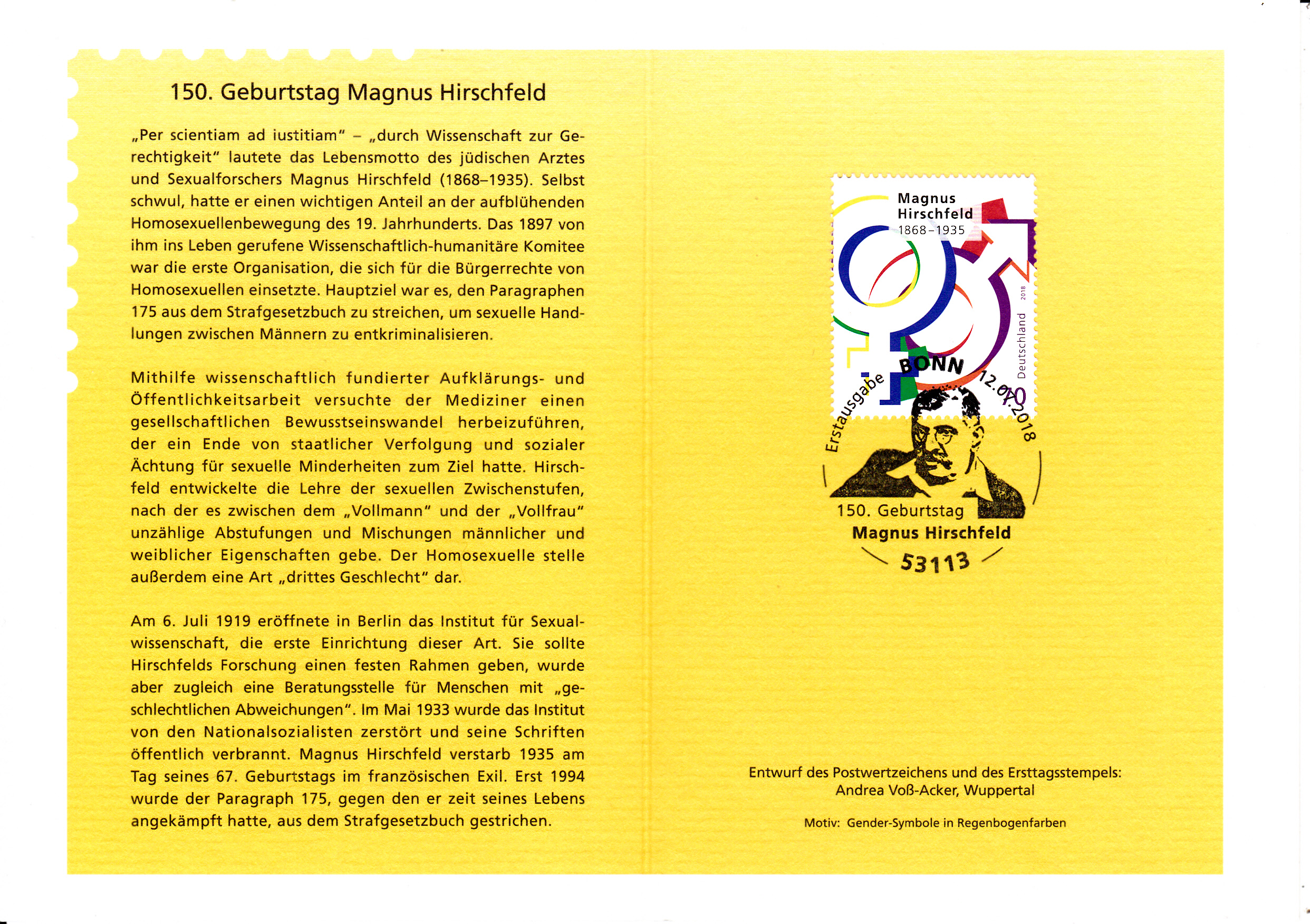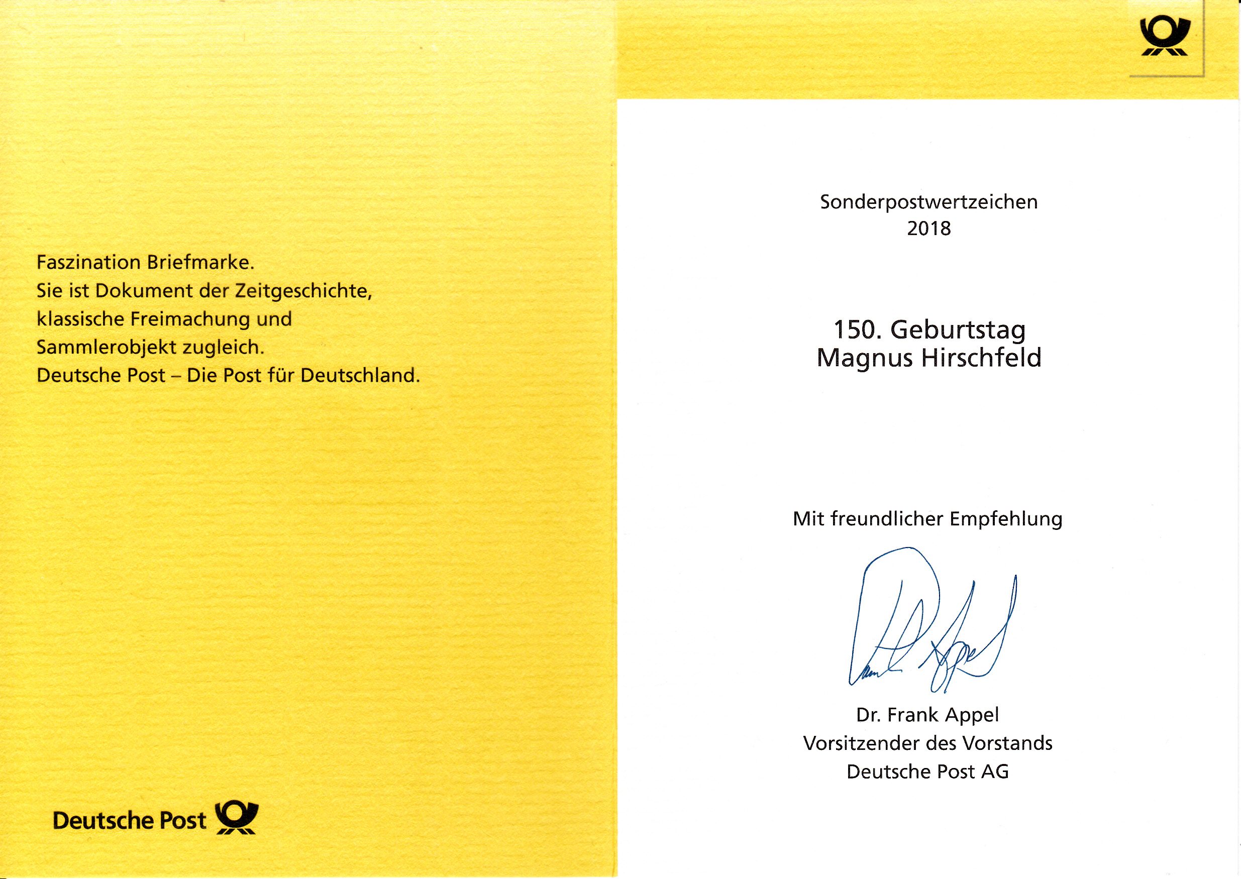 Klappkarte des Vorstandsvorsitzenden der Deutschen Post AG mit der Marke zum 150. Geburtstag von Magnus Hirschfeld und dem Ersttagsonderstempel aus Bonn.