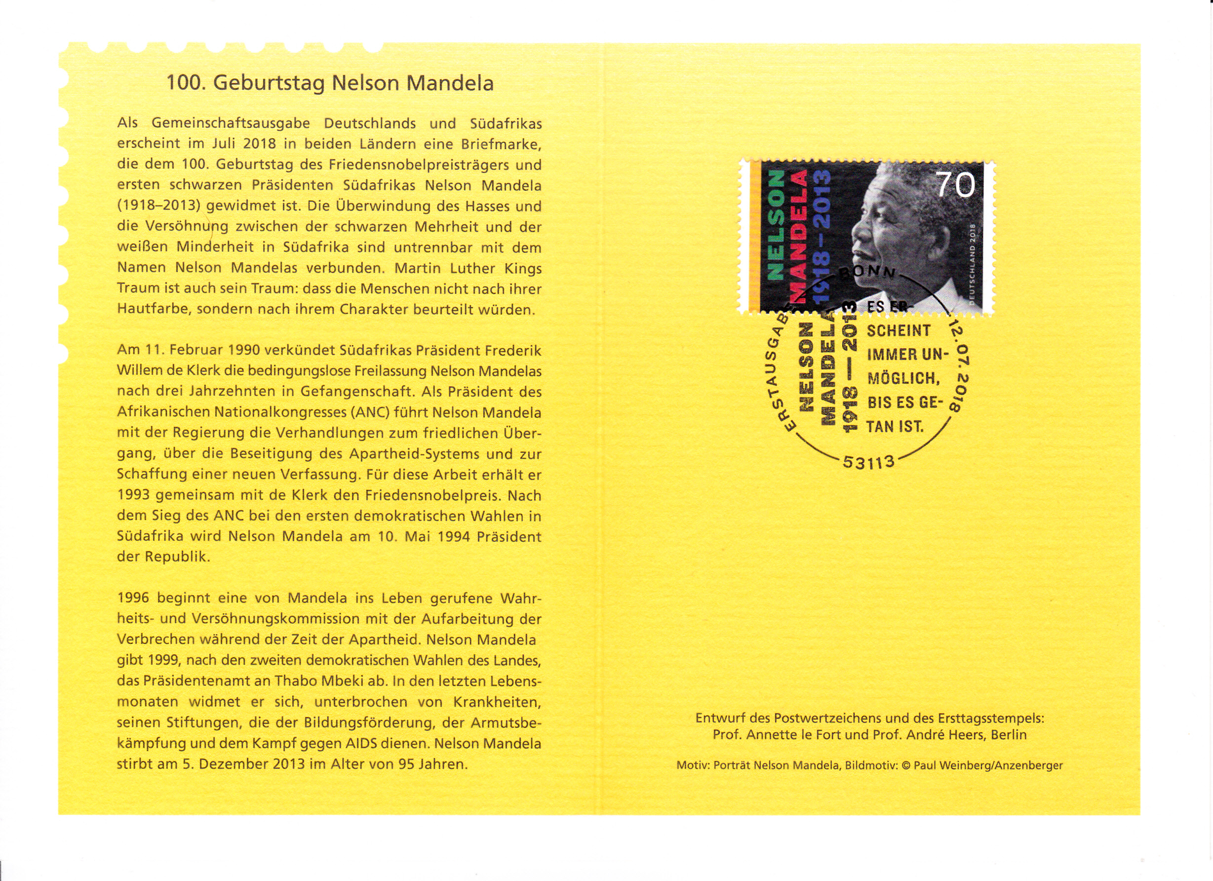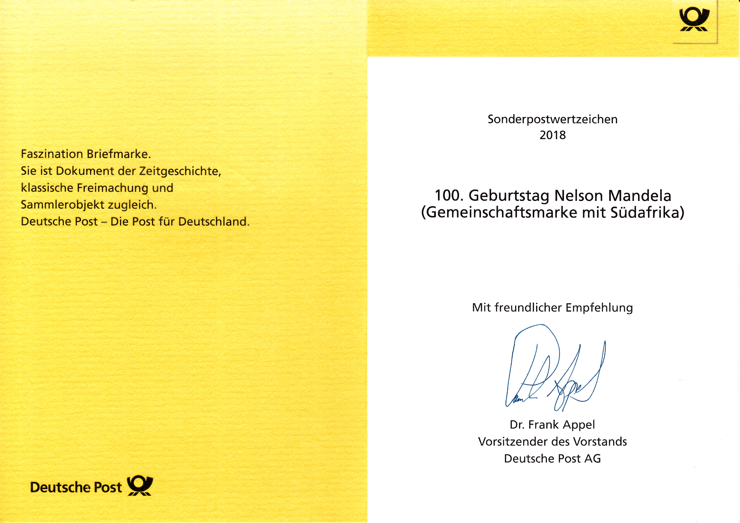 Klappkarte des Vorstandsvorsitzenden der Deutschen Post AG mit der Marke zum 100. Geburtstag von Nelson Mandela und dem Ersttagsonderstempel aus Bonn.