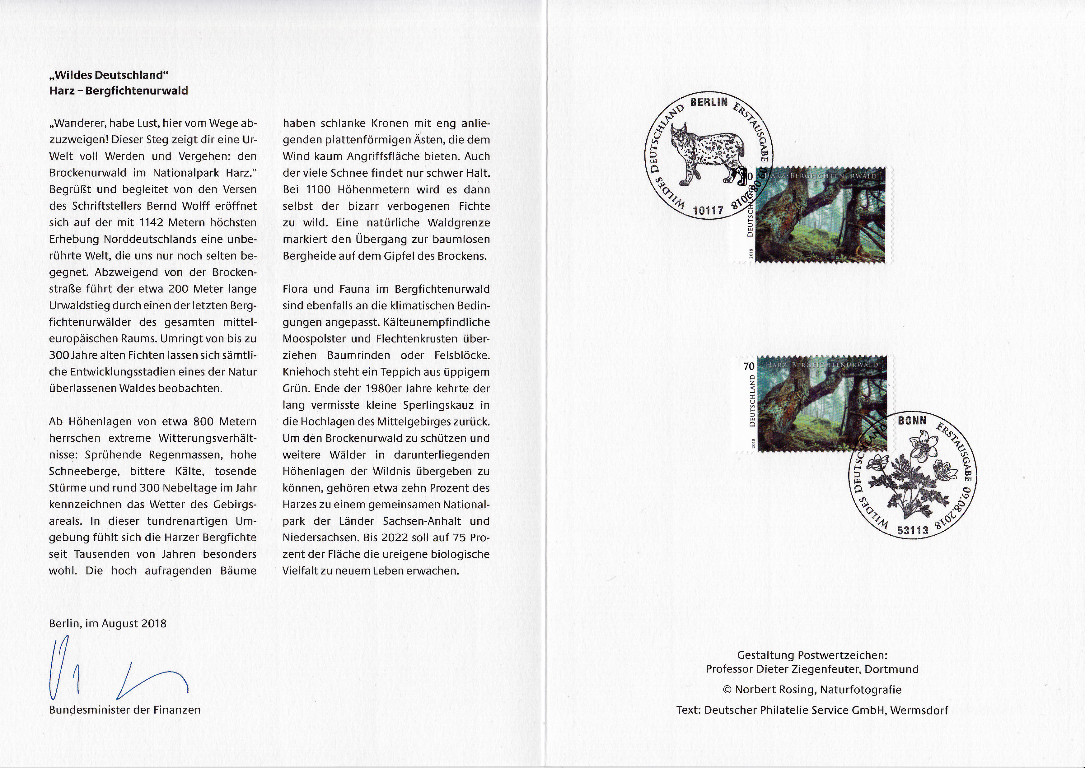 Ministerkarte des Finanzministers mit zwei Marken aus der Serie "Wildes Deutschland " mit dem Motiv "Bergfichtenurwald am Brocken im Harz" und mit den beiden Ersttagsonderstempel Bonn und Berlin.