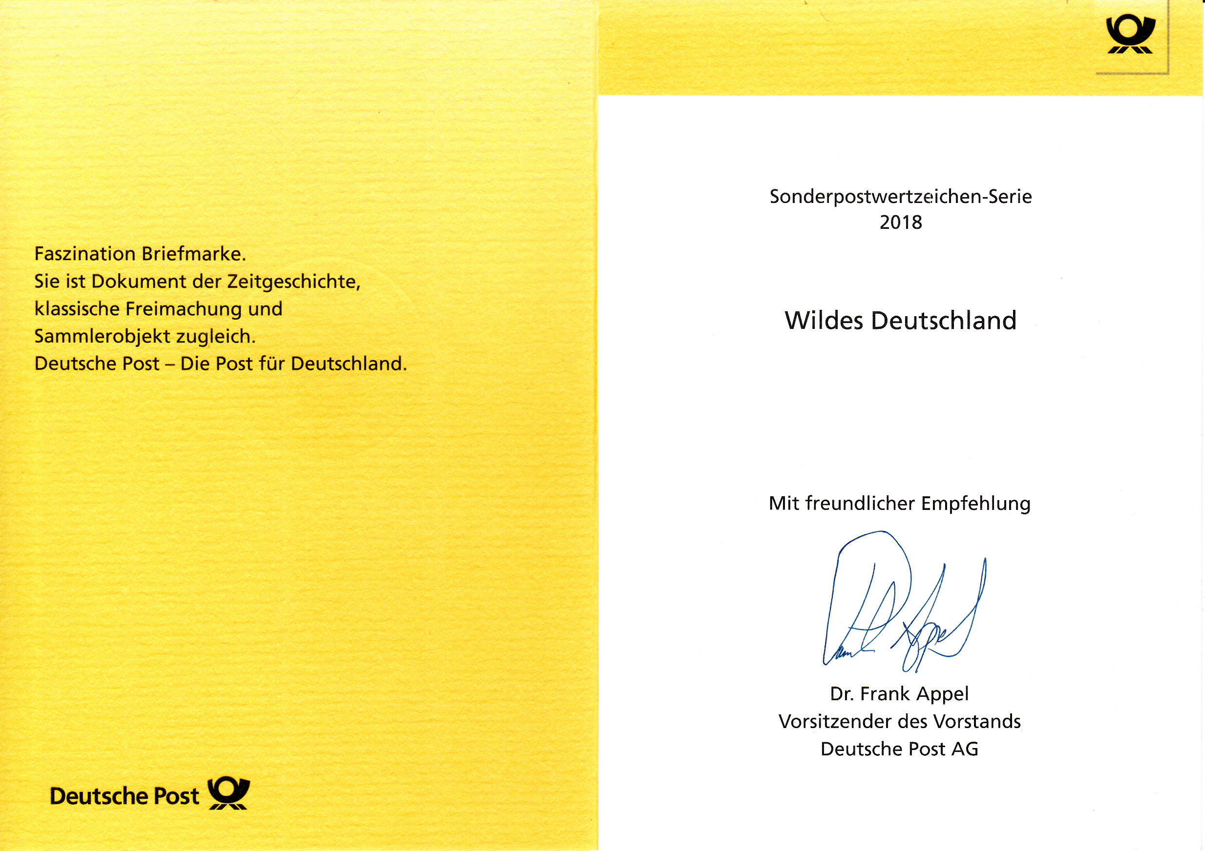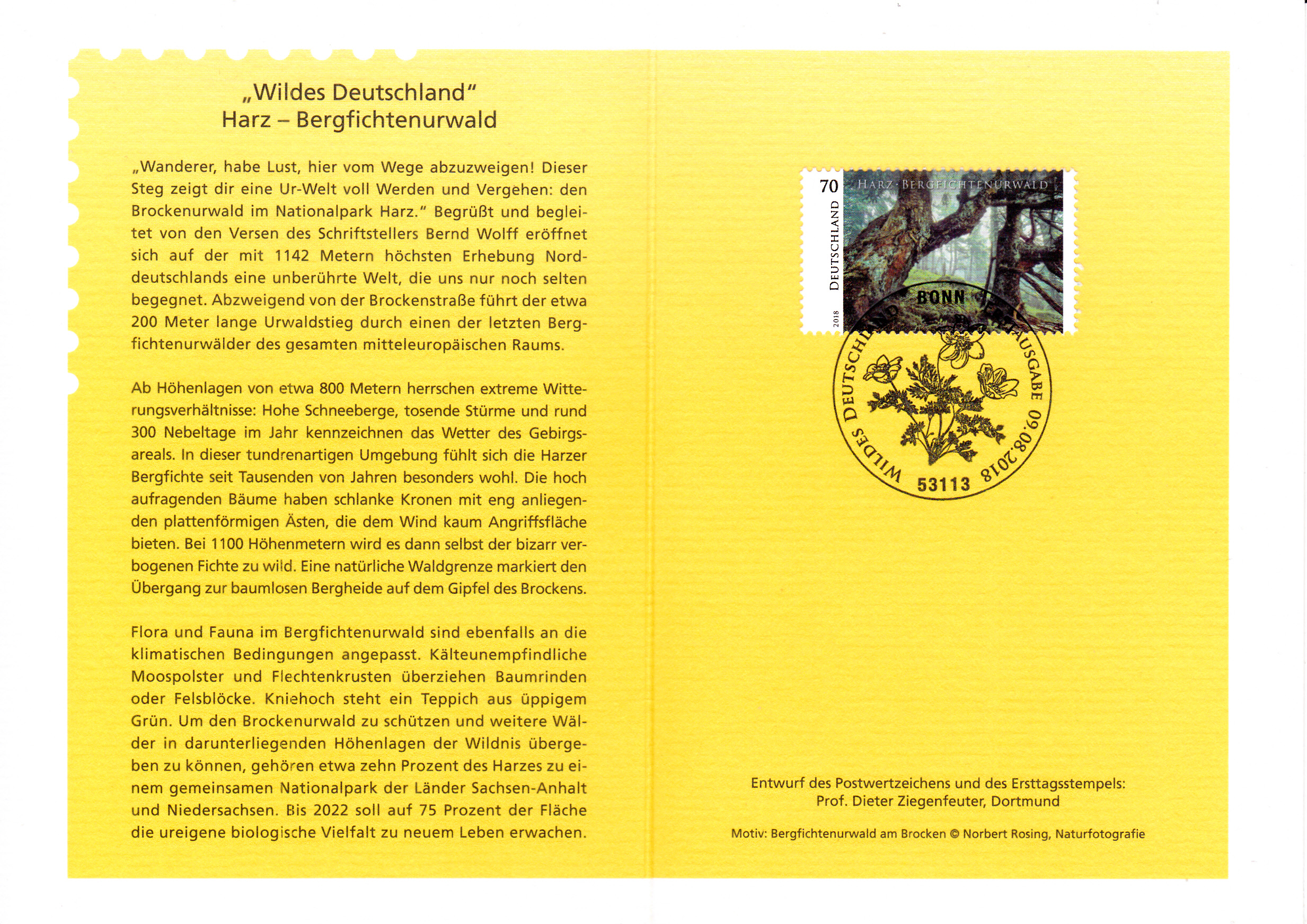 Klappkarte des Vorstandsvorsitzenden der Deutschen Post AG mit der Marke aus der Serie "Wildes Deutschland " mit dem Motiv "Bergfichtenurwald am Brocken im Harz" und mit dem Ersttagsonderstempel Bonn.