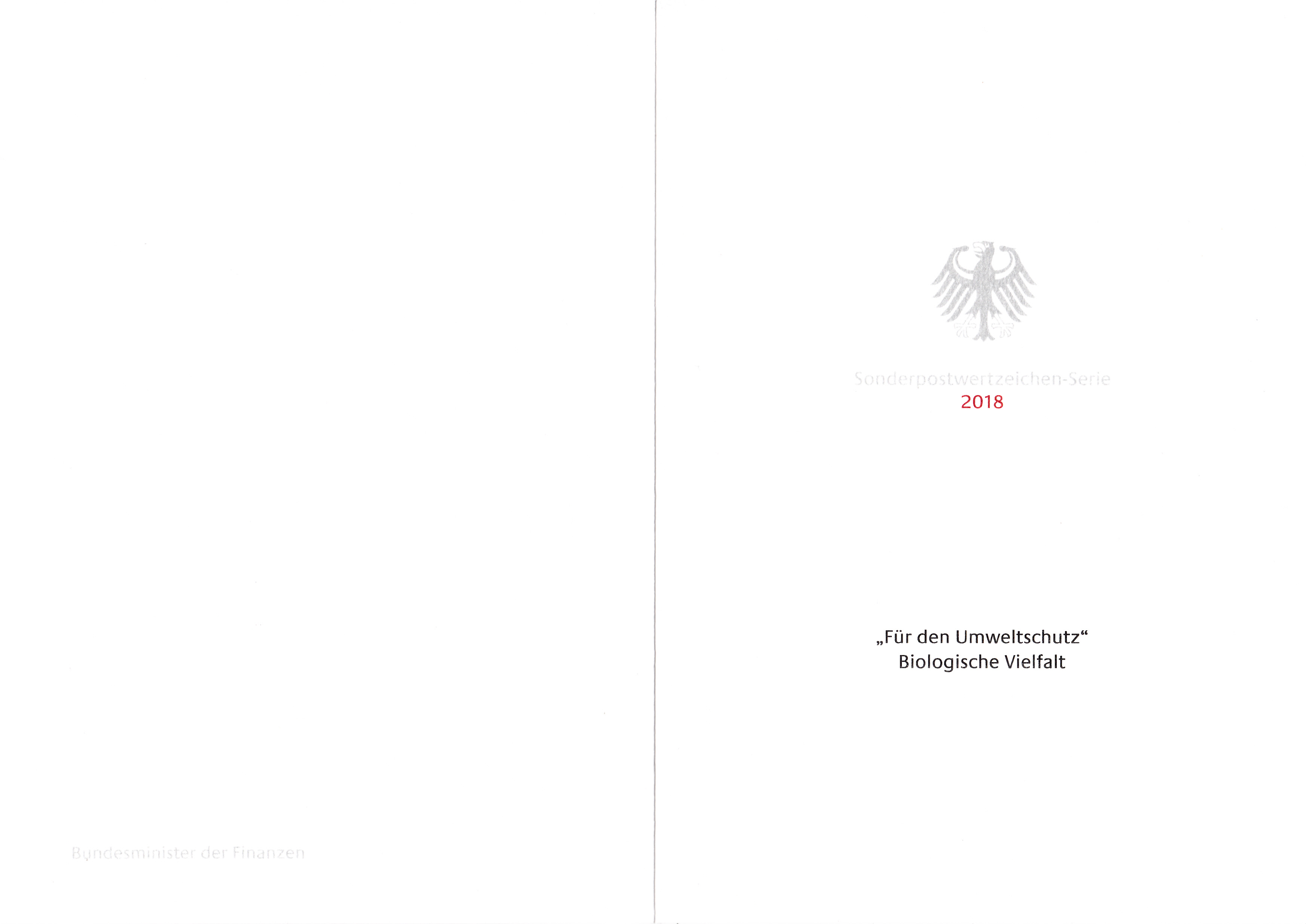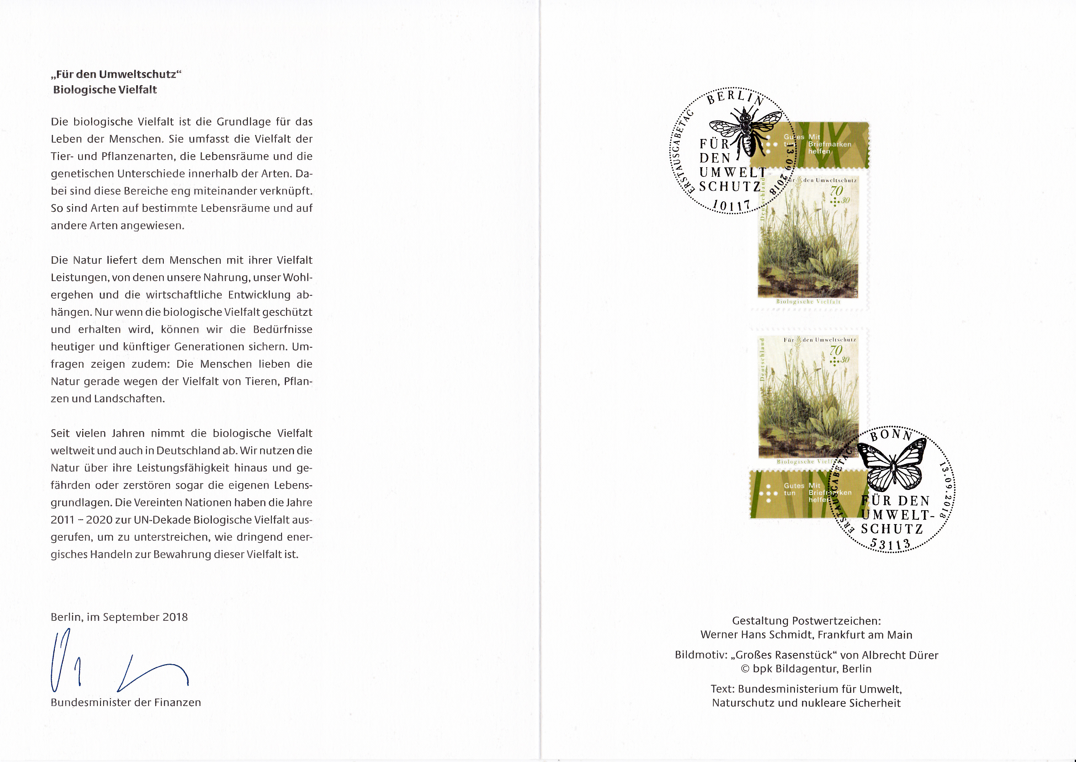Ministerkarte des Finanzministers mit zwei Marken aus der Serie "Umweltschutz" zum Thema "Biologische Vielfalt" mit dem Motiv "Wildwiese mit verschiedenen Pflanzen und Tieren" und mit den beiden Ersttagsonderstempel Bonn und Berlin.