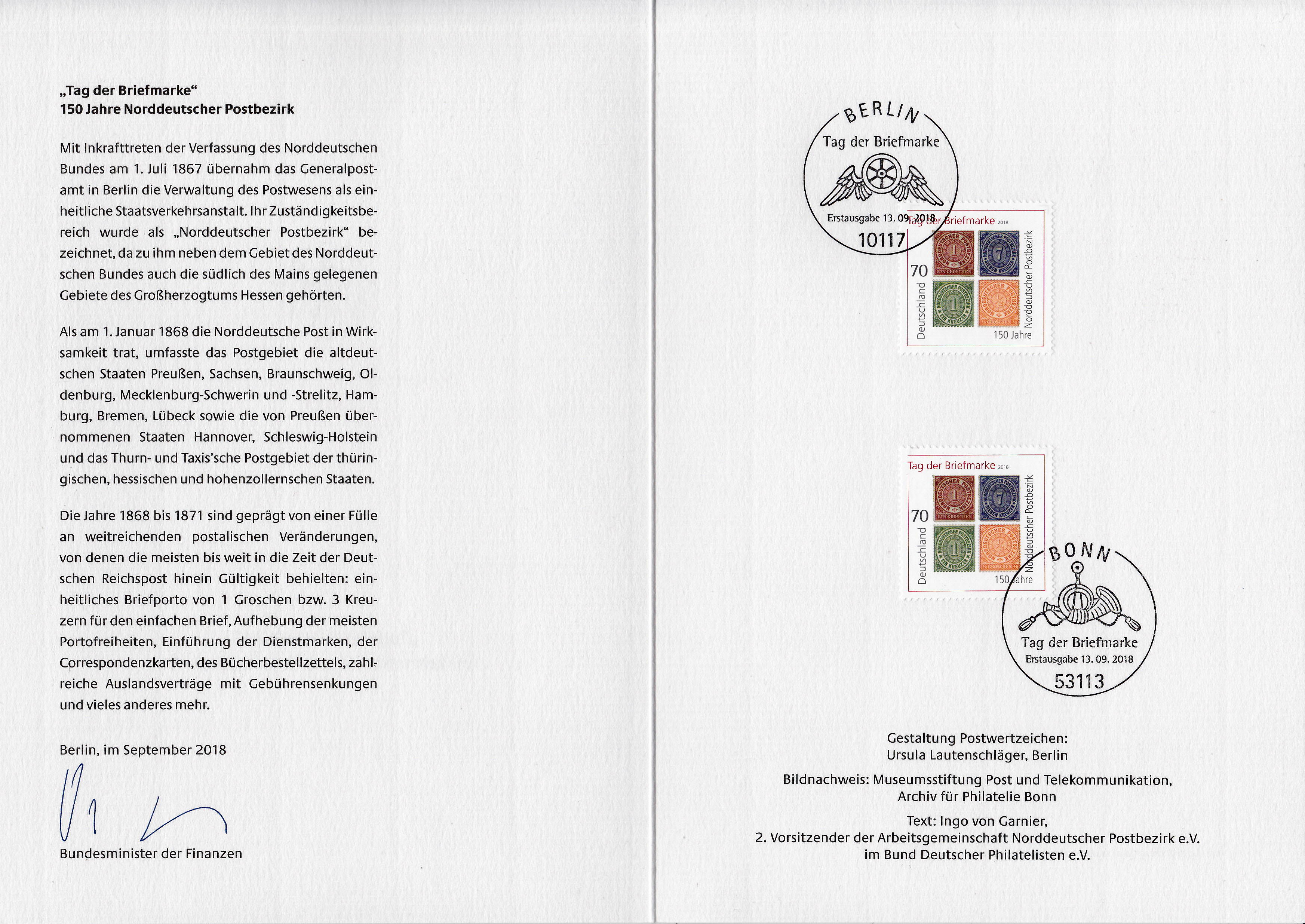 Ministerkarte des Finanzministers mit zwei Marken zum Tag der Briefmarke zum Thema "150 Jahre Norddeutscher Postbezirk" und mit den beiden Ersttagsonderstempel Bonn und Berlin.