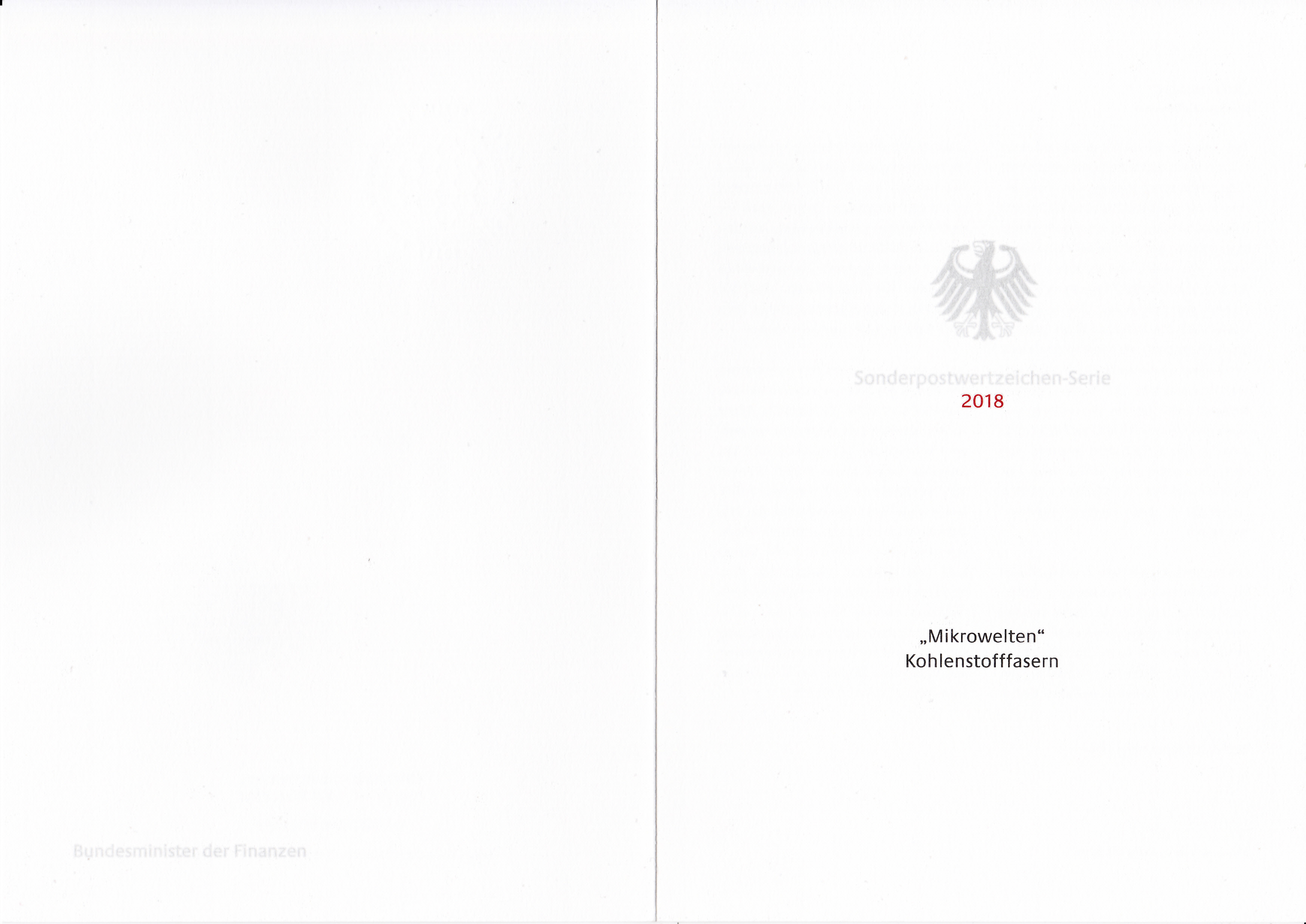 Ministerkarte des Finanzministers mit zwei Marken aus der Serie "Mikrowelten" mit dem Motiv "Kohlenstofffasern (400-fache Vergrößerung)" und mit den beiden Ersttagsonderstempel Bonn und Berlin.