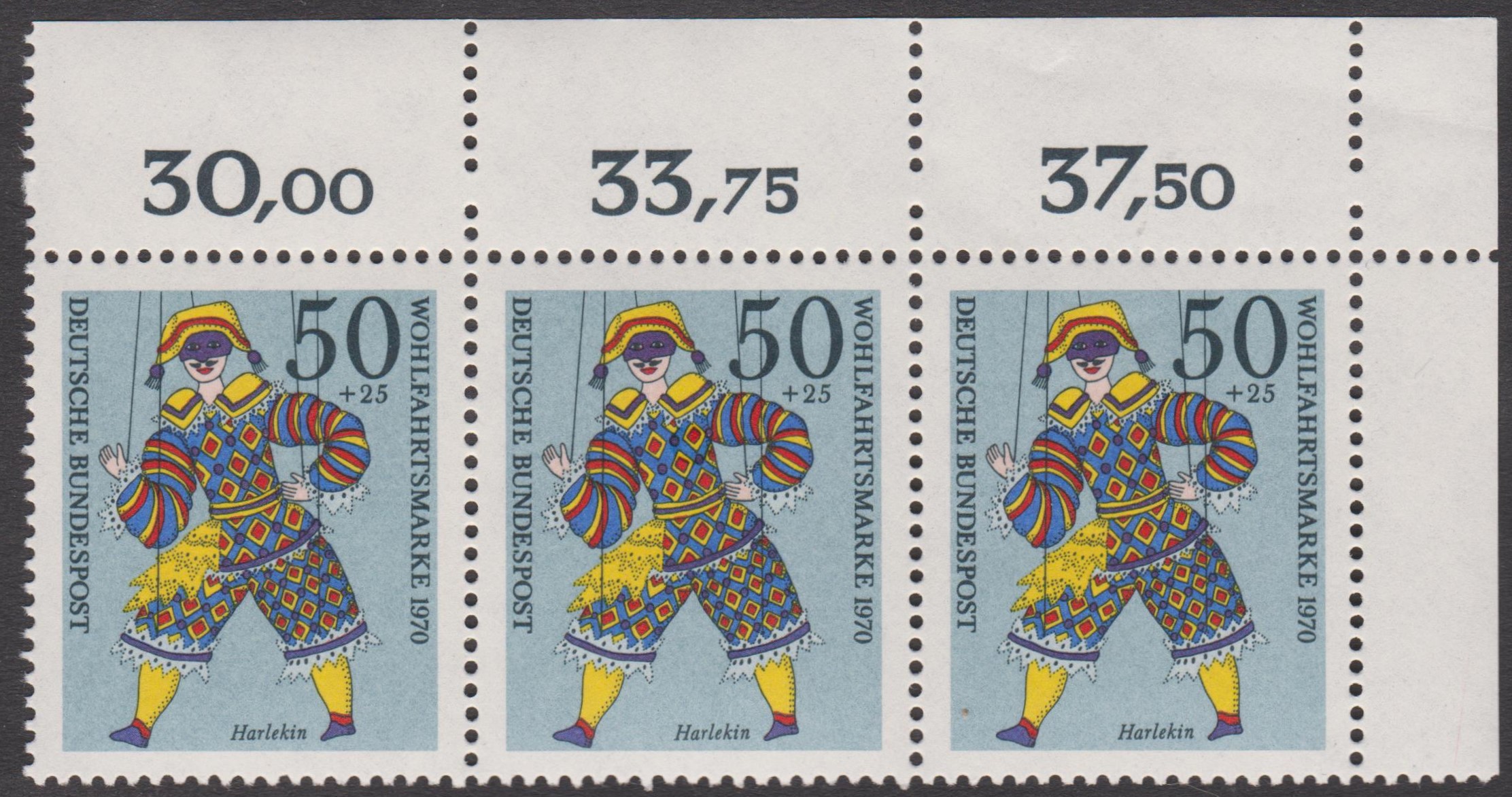 Hier als Beispiel ein waagerechter Dreierstreifen vom oberen Bogenrand der BUND MiNr. 653, bei dem man das fehlende Zähnungsloch im Oberrand sehr gut erkennt: