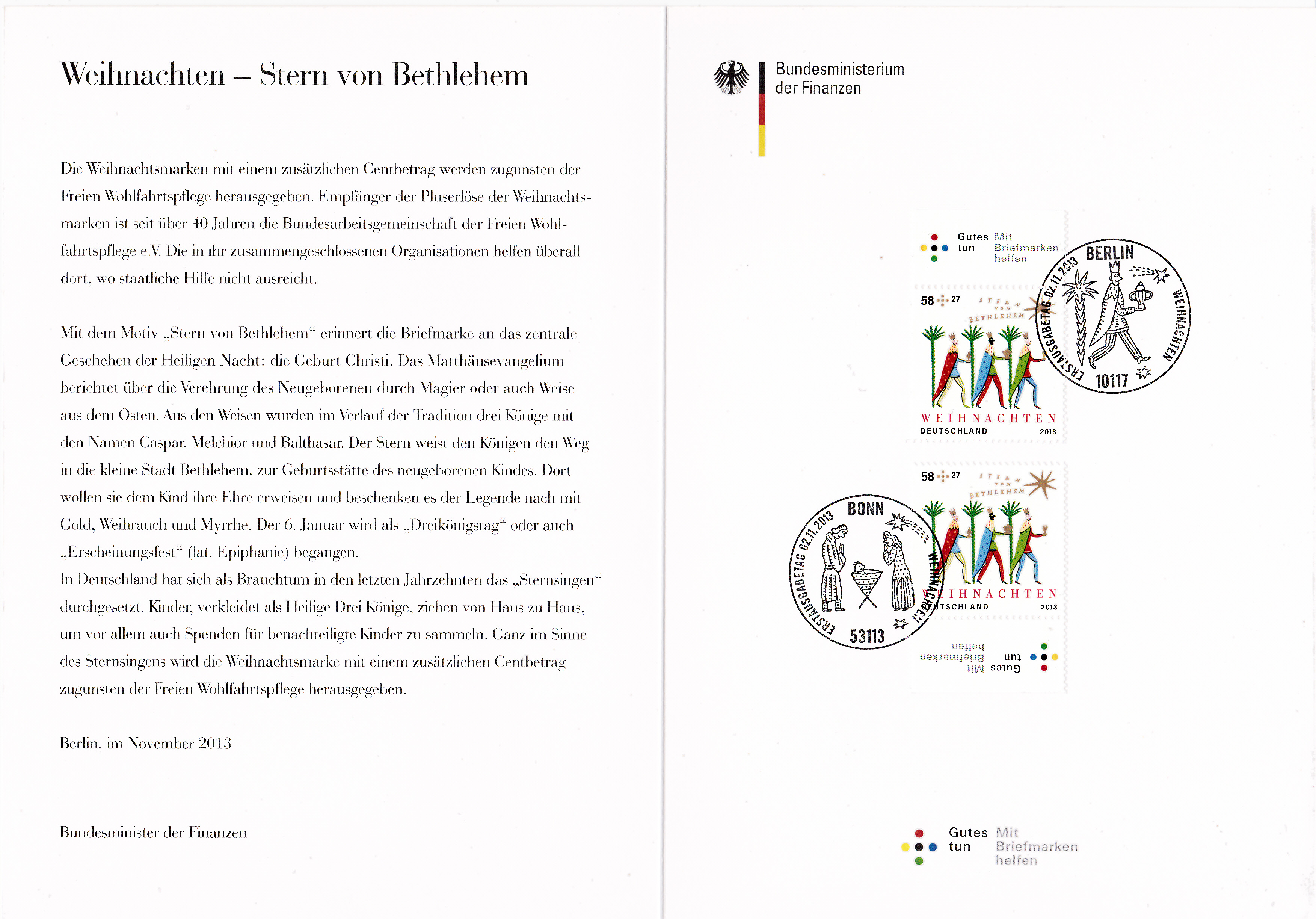 Bei dieser Ministerkarte mit der Weihnachtsmarke 2013 wurden zwei Weihnachtsmarken verklebt, damit auch beide Ersttagsonderstempel abgeschlagen werden konnten. Die Karte ist auch ohne gedruckte Unterschrift des Bundesfinanzministers, weil am 22. September 2013 Bundestagswahlen stattfanden und zum Zeitpunkt der Herstellung dieser Karten noch nicht feststand, wer am Ausgabetag das Amt des Finanzministers inne hat.