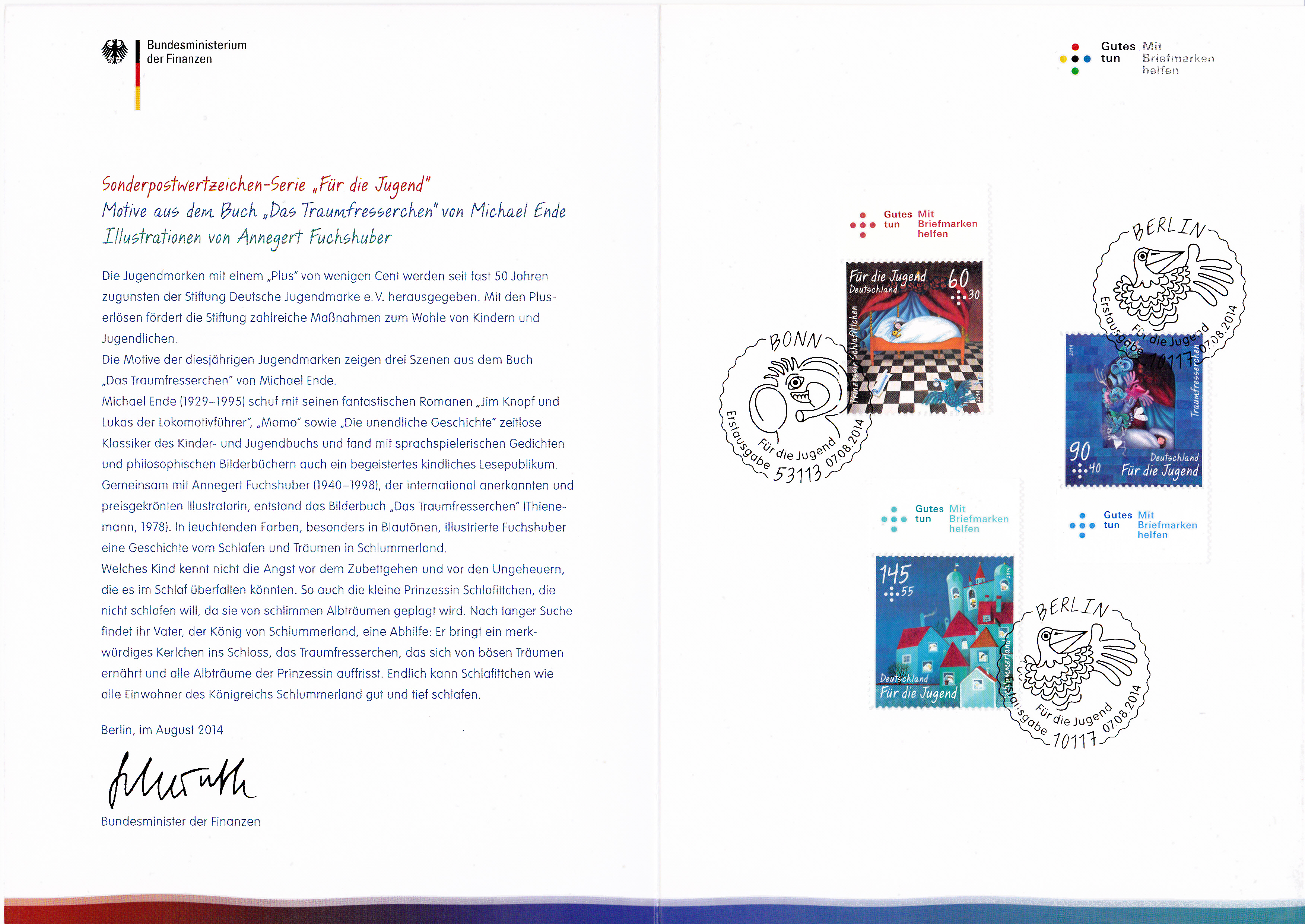 Hier folgt eine der "farbigen" Ministerkarten mit den Marken "Für die Jugend" 2014 mit den Motiven aus "Das Traumfresserchen" von Michael Ende: