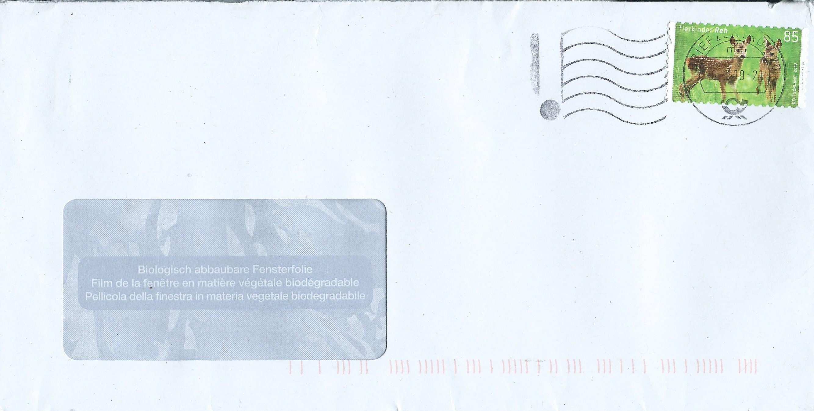 ein weiterer Briefausschnitt mit dem Schraubenkopf mitten im Werbestempel habe ich von einer Freundin erhalten können. Dieses Stück wurde ebenfalls im Briefzentrum 20 am 12.3.19 gestempelt: