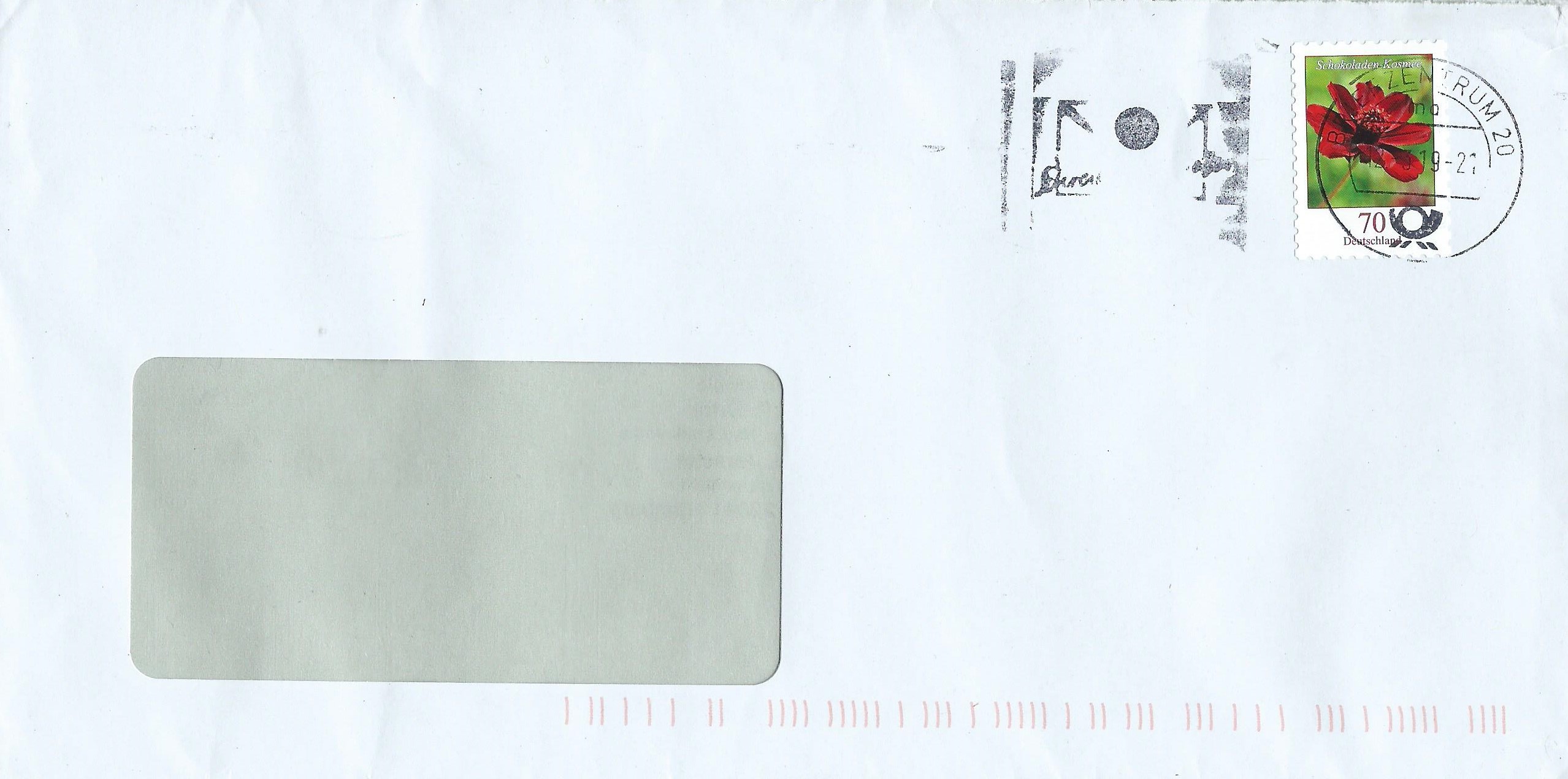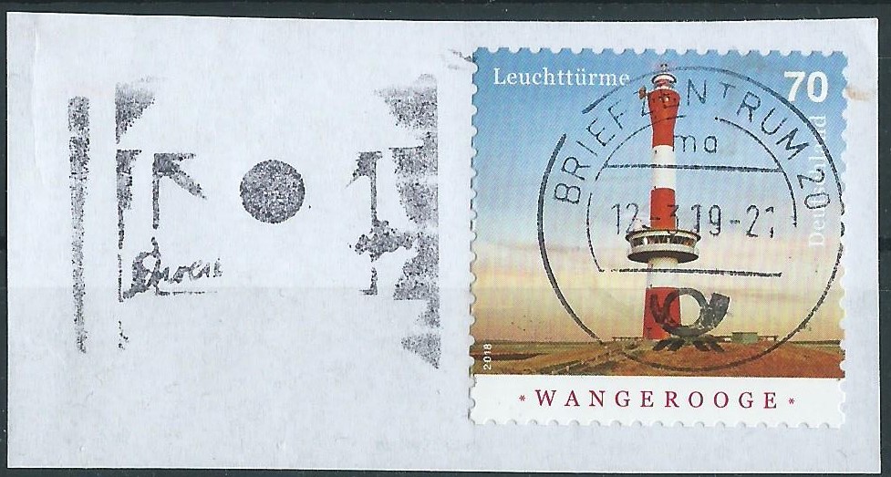 am 5.3.19 war im Briefzentrum 20 mal wieder der Schraubenkopf im Maschinenstempel sichtbar. Links unten neben dem Wellenstempeleinsatz ist er zu sehen. Als Frankatur dient eine selbstklebende Marke Wangerooge zu 70 Cent.