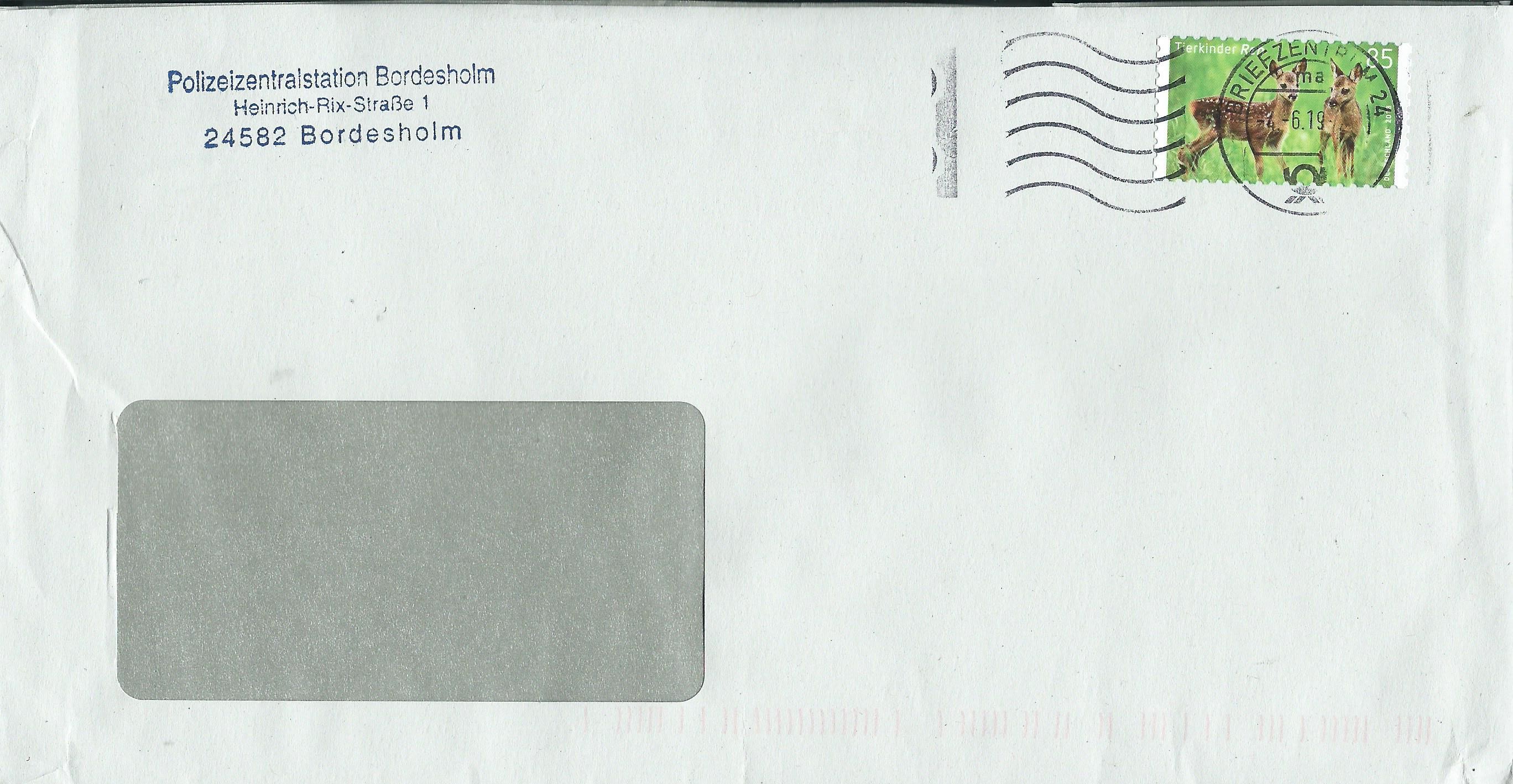 bei diesem Stempelabdruck ist links mal wieder ein Teil der Befestigung zu sehen. Herkunft des Stempels ist das Briefzentrum 24 am 4.6.19: