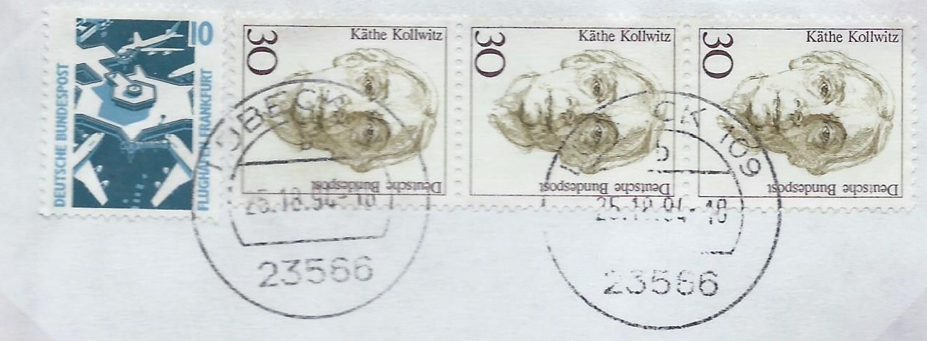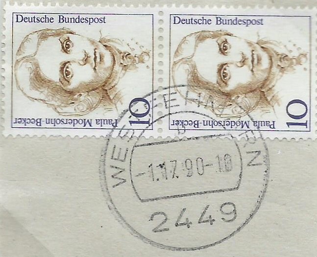 Den Anfang macht Westfehmarn mit einem neuen Datum: 1.17.90 auf der Frauen-Marke 10 Pf. Der liegt mir sogar gleich auf 2 Briefausschnitten vor. Da haben die Postler glatt mal 5 Monate Zuschlag gegeben…
