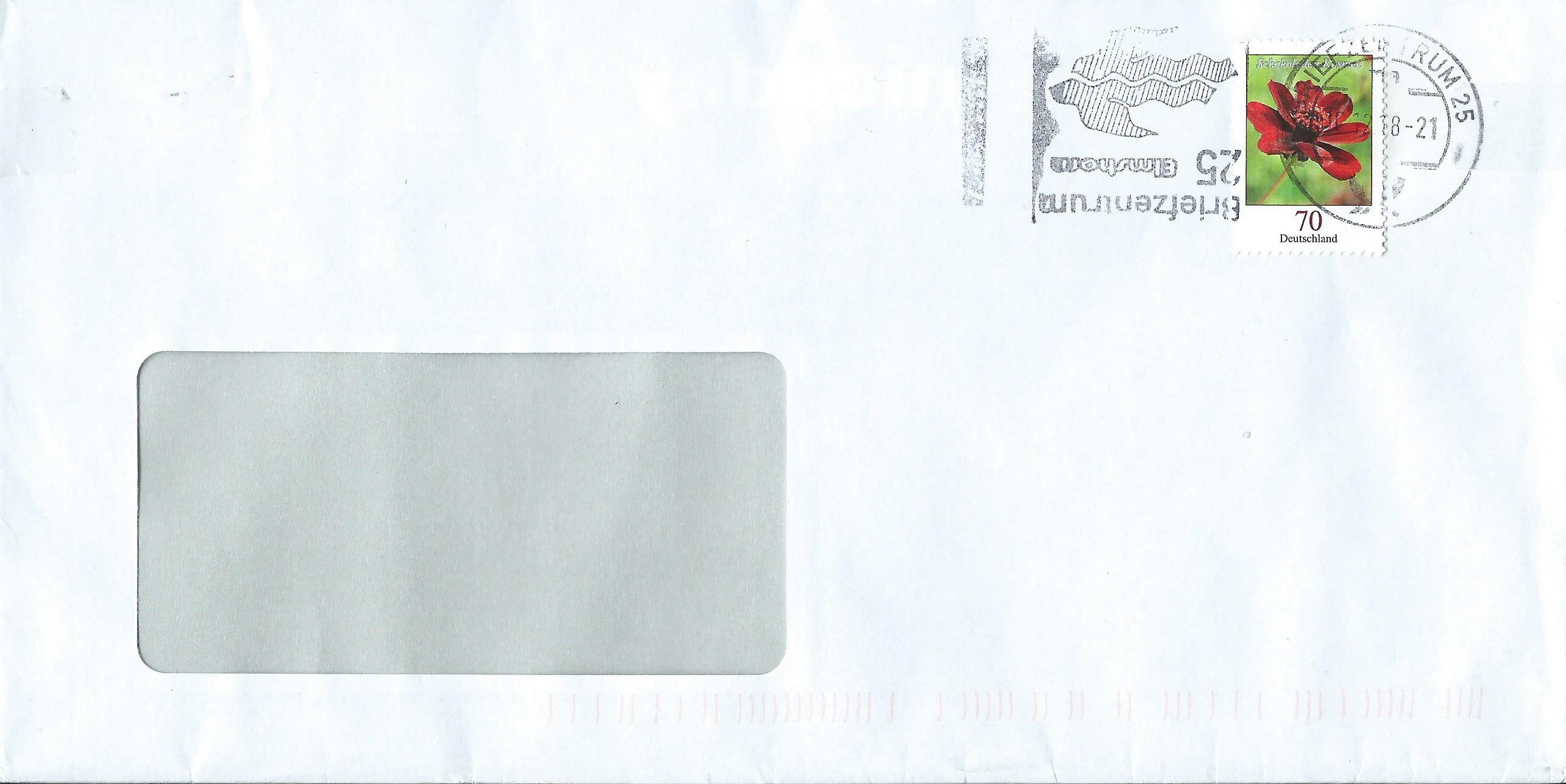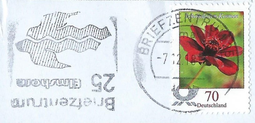 es gibt einen neuen Kopfsteher zu vermelden: Der Werbeeinsatz mit der Eigenwerbung vom Briefzentrum 25 Elmshorn kann hier mit einem Briefausschnitt vom 7.12.18 belegt werden: