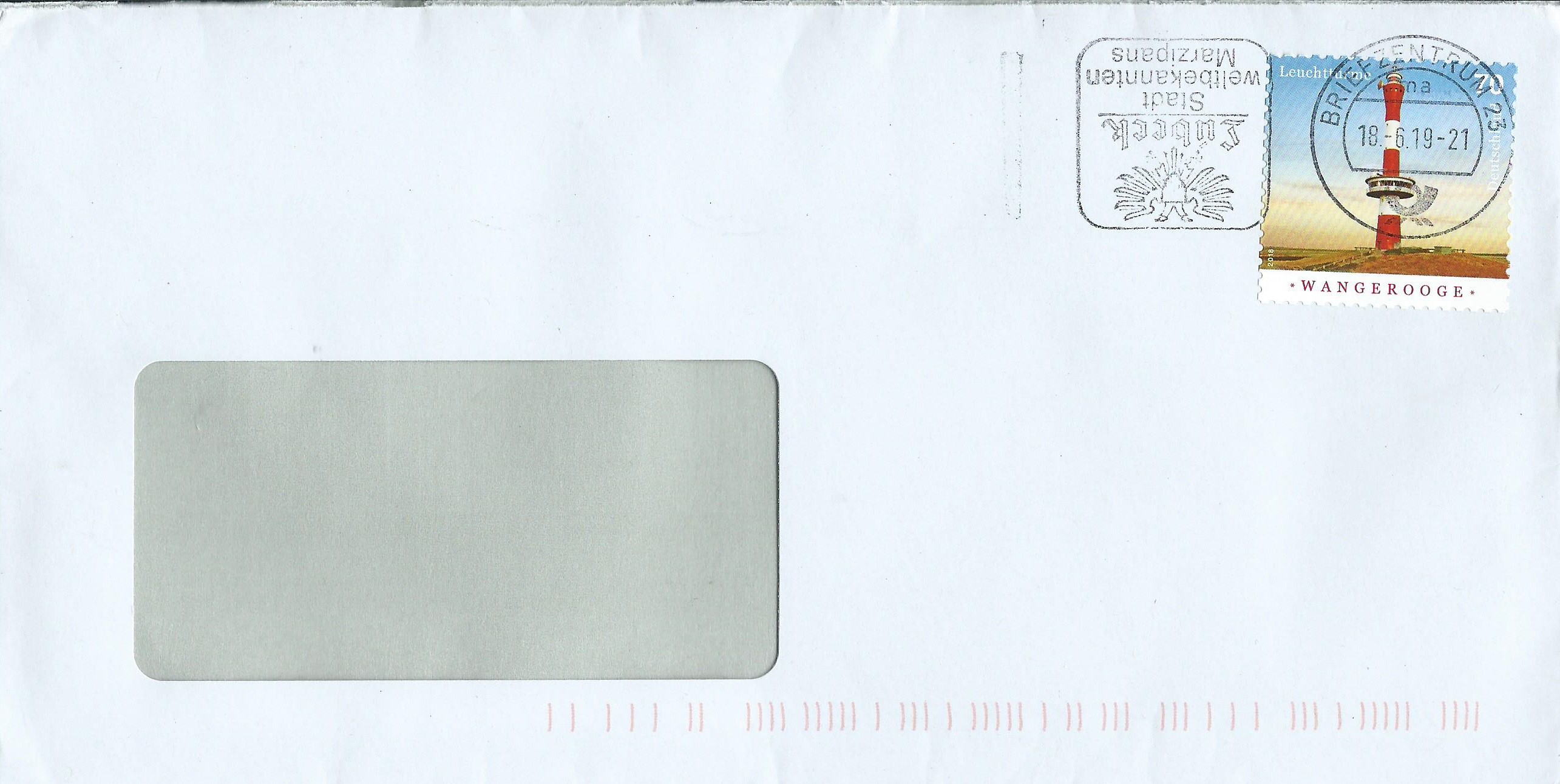 Lübeck steht mal wieder Kopf! Der Werbeeinsatz der Stempelmaschine mit dem Unterscheidungsbuchstaben ma wurde am 18.6.19 falsch herum in die Stempelmaschine eingesetzt. Hier einmal auf einem Briefausschnitt mit der aktuellen Europa-Marke:
