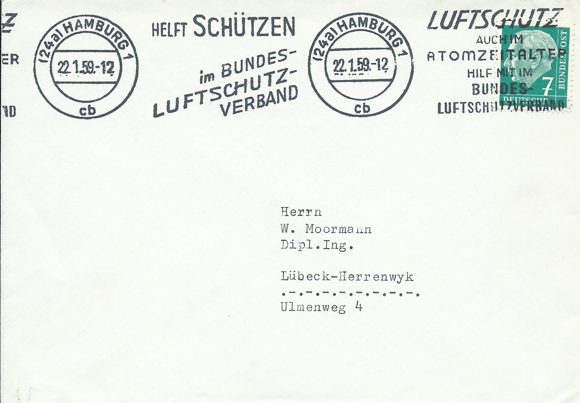Am 22.1.59 wirbt Hamburg für „Helft schützen im Bundes-Luftschutz-Verband“: