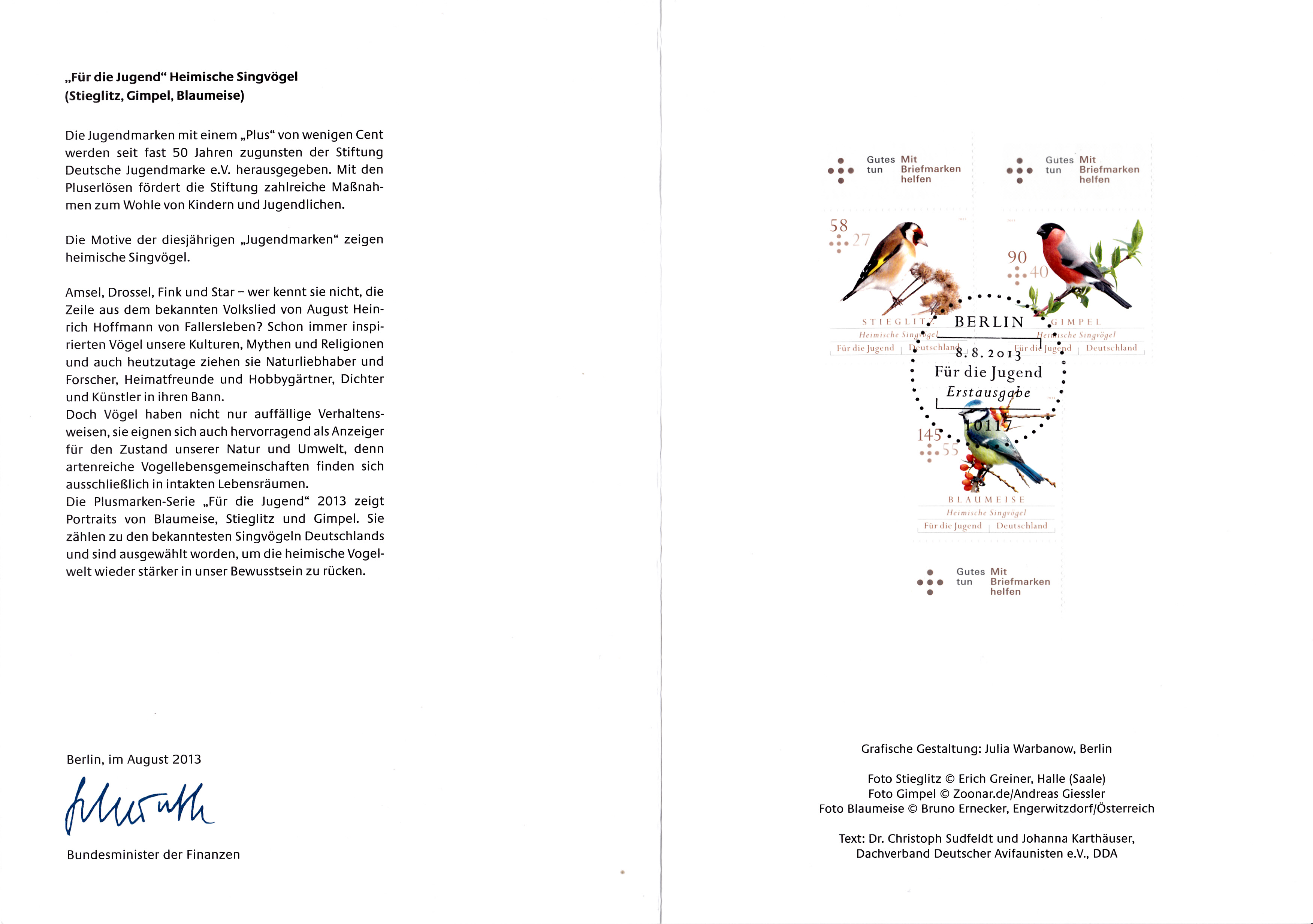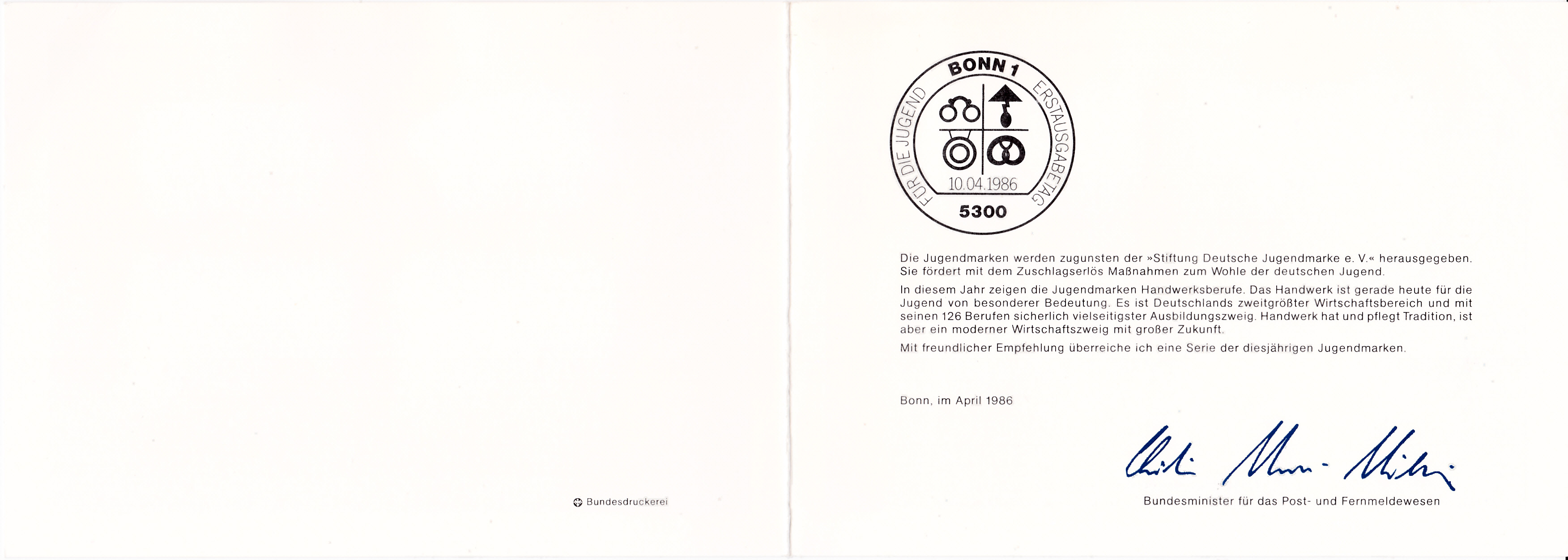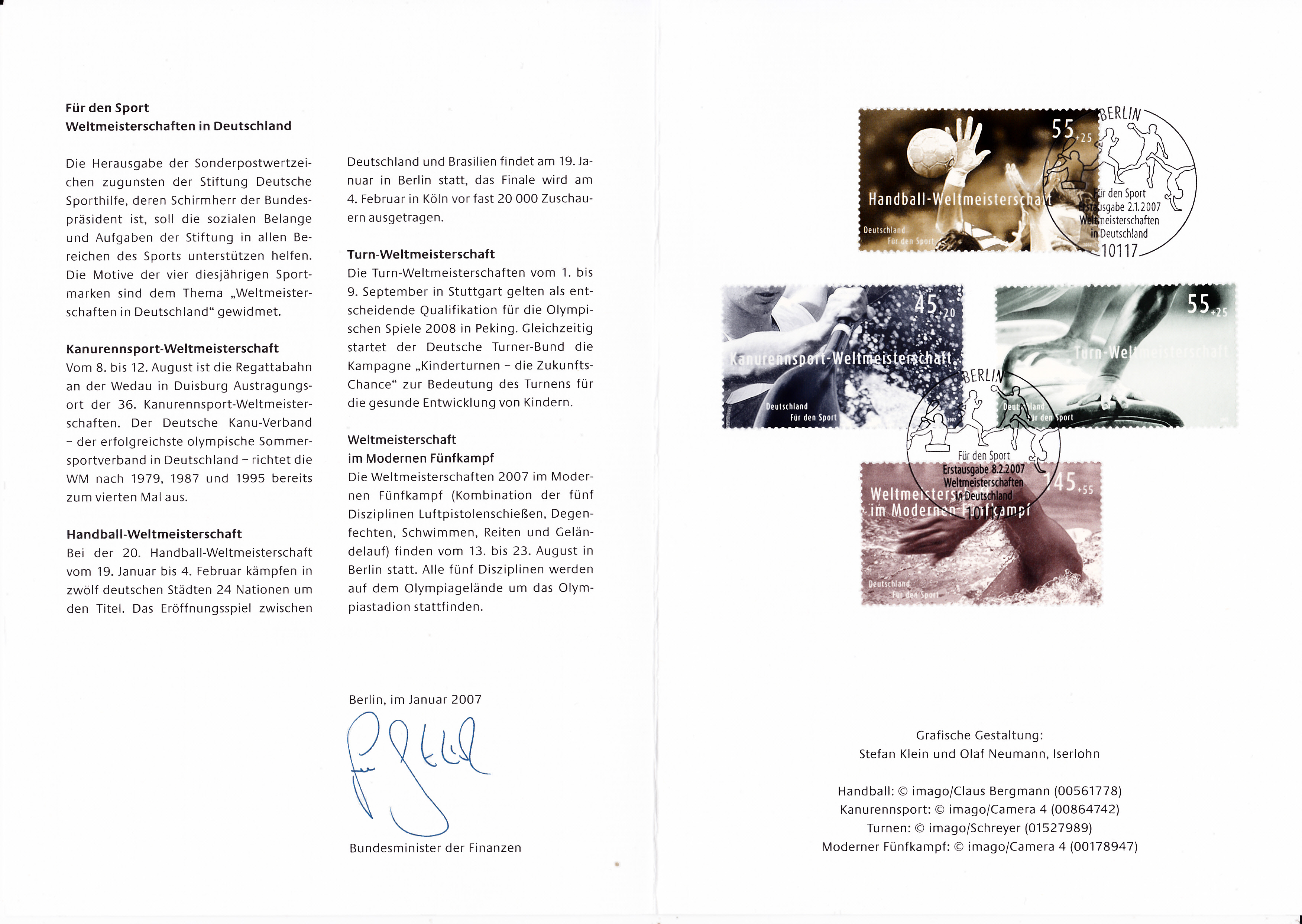 Die farbige Ministerkarte des Finanzministers mit den Marken "Für den Sport" 2007 enthält die vier Zuschlagsmarken des Jahres 2007. Eine kleine Besonderheit gibt es aber: Da die Marke zu 55+25 Cent zur Handball-Weltmeisterschaft bereits am 2.1.2007 erschienen ist, die drei weiteren Marken aber erst am 8.2.2007 tragen die zwei Ersttagstempel Berlin verschiedene Stempeldaten, die beiden Bonner Ersttagstempel haben das Datum 8.2.2007.