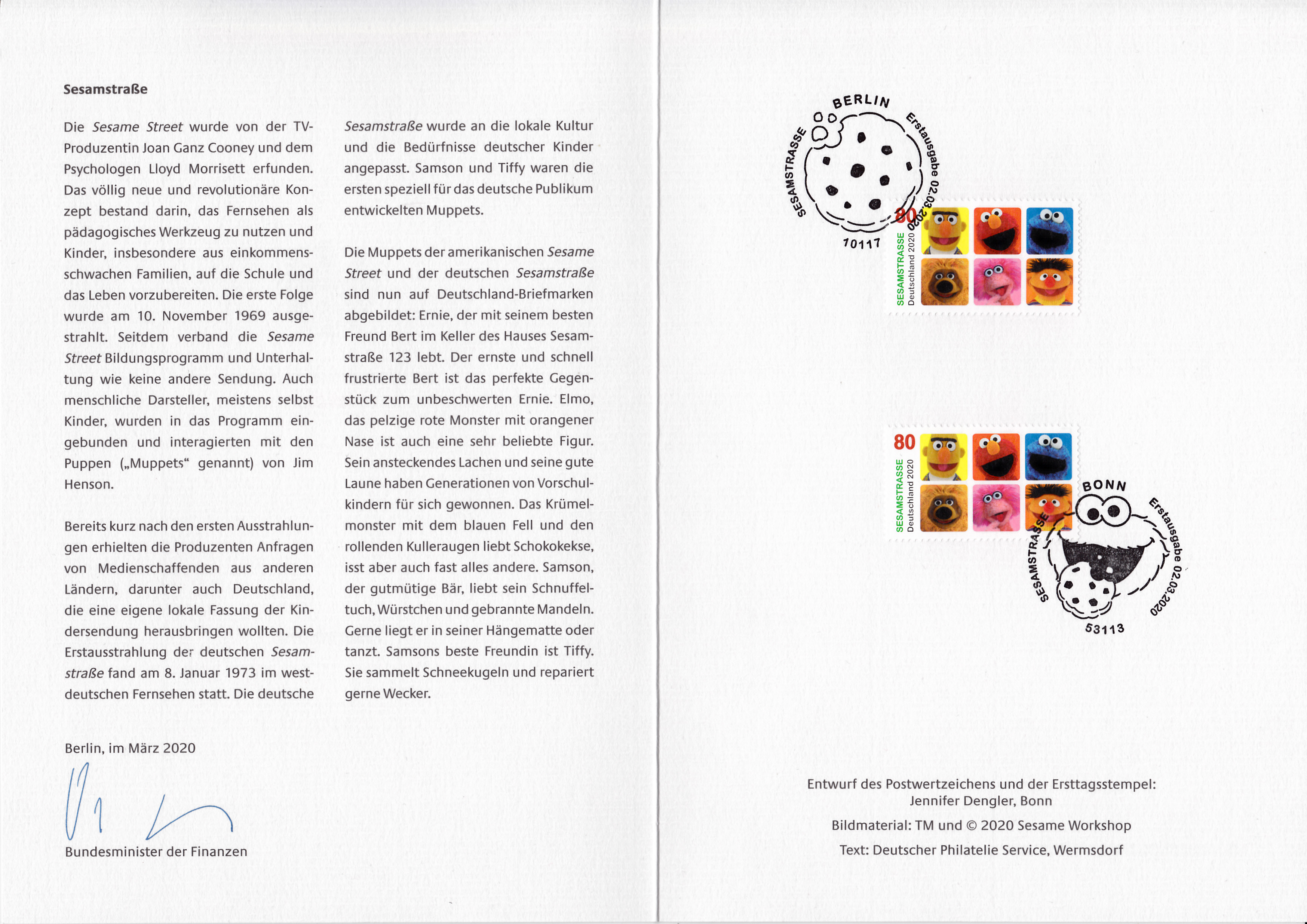 Jetzt kommen die Ministerkarten aus dem April 2020. Ministerkarte des Finanzministers mit zwei Marken der Dauerserie "Blumen" zu 50 Cent mit dem Motiv "Zinnie (Zinnia elegans)" (MiNr 3535) und den beiden Ersttagsonderstempel Bonn und Berlin.
