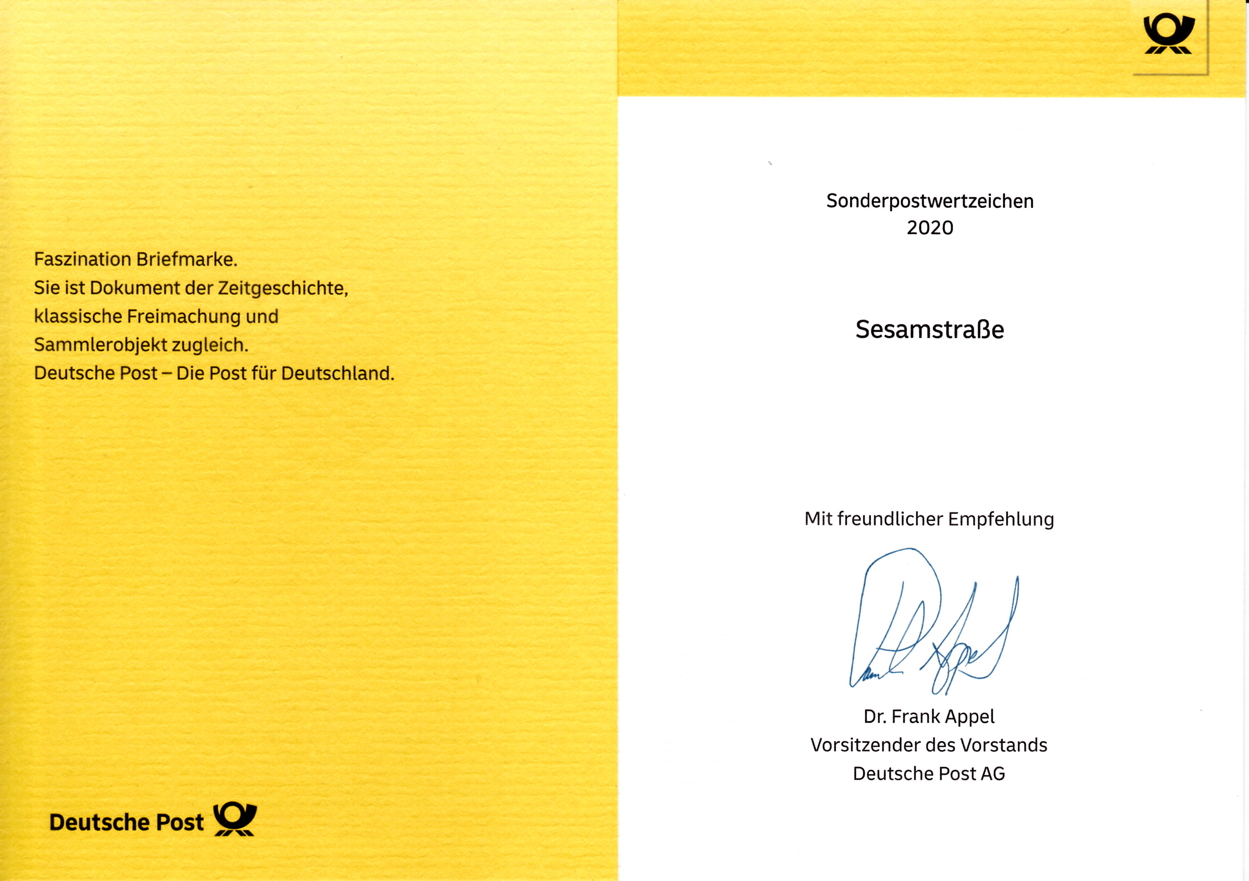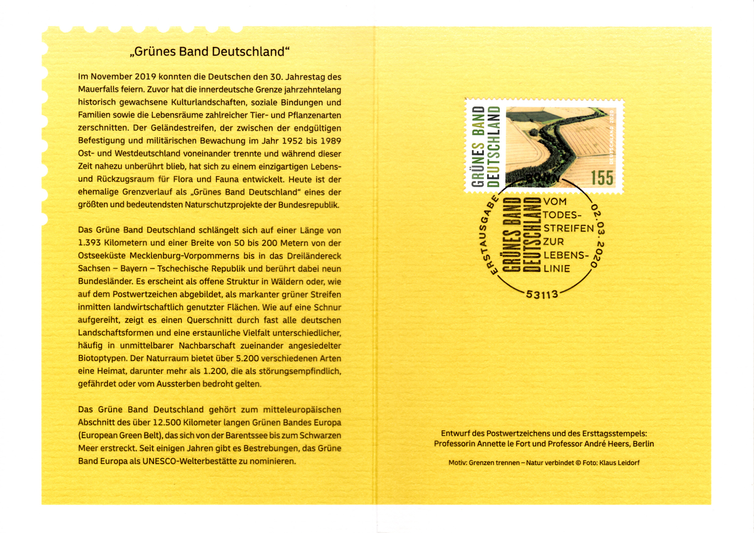 Klappkarte des Vorstandsvorsitzenden der Deutschen Post AG mit der Marke Naturschutzprojekt "Grünes Band Deutschland" (MiNr 3529) und mit dem Ersttagsonderstempel Bonn.