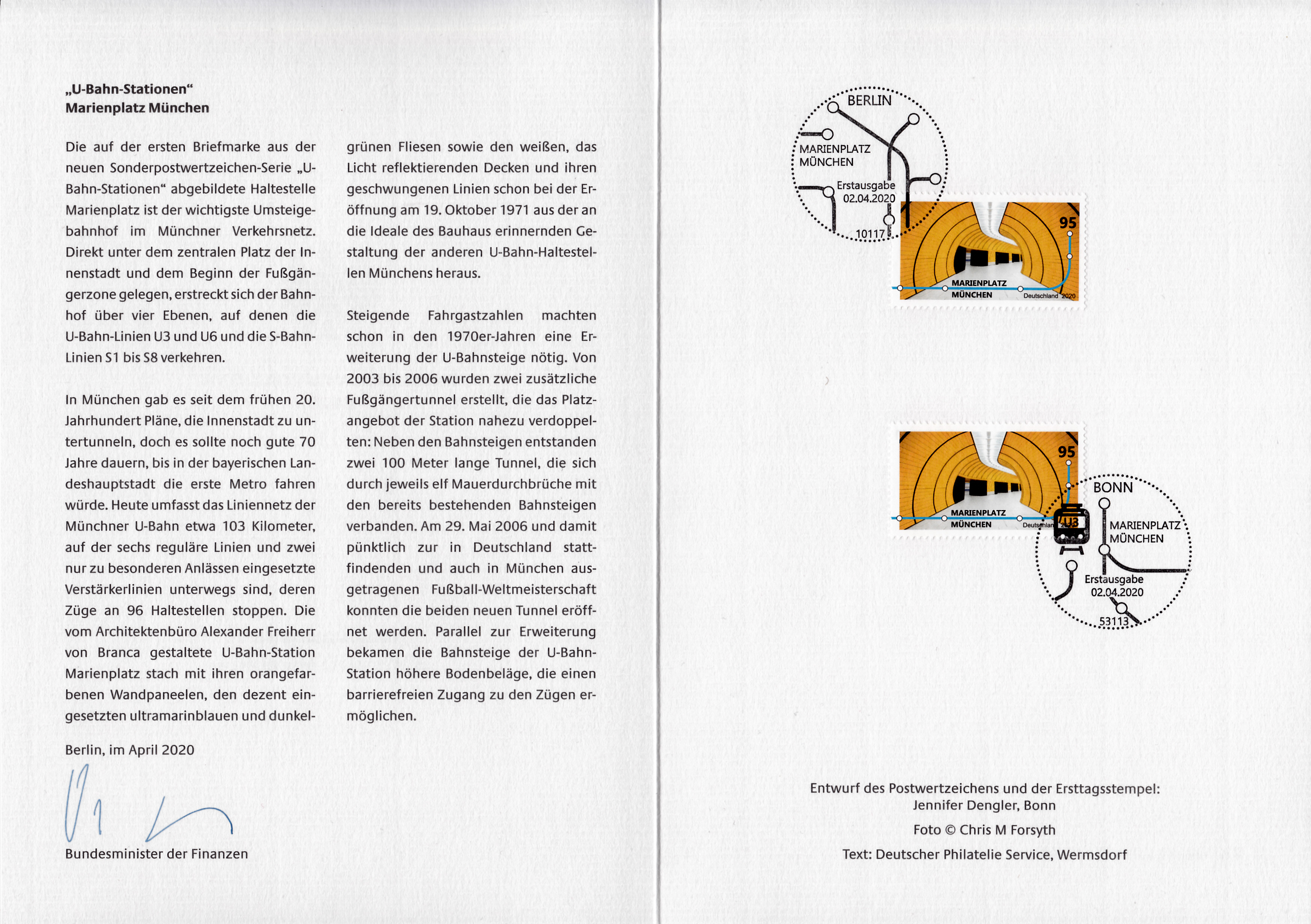 Ministerkarte des Finanzministers mit zwei Marken der Serie "U-Bahn-Stationen" mit dem Motiv "U-Bahn-Haltestelle Marienplatz, München" (MiNr 3538) und den beiden Ersttagsonderstempel Bonn und Berlin.