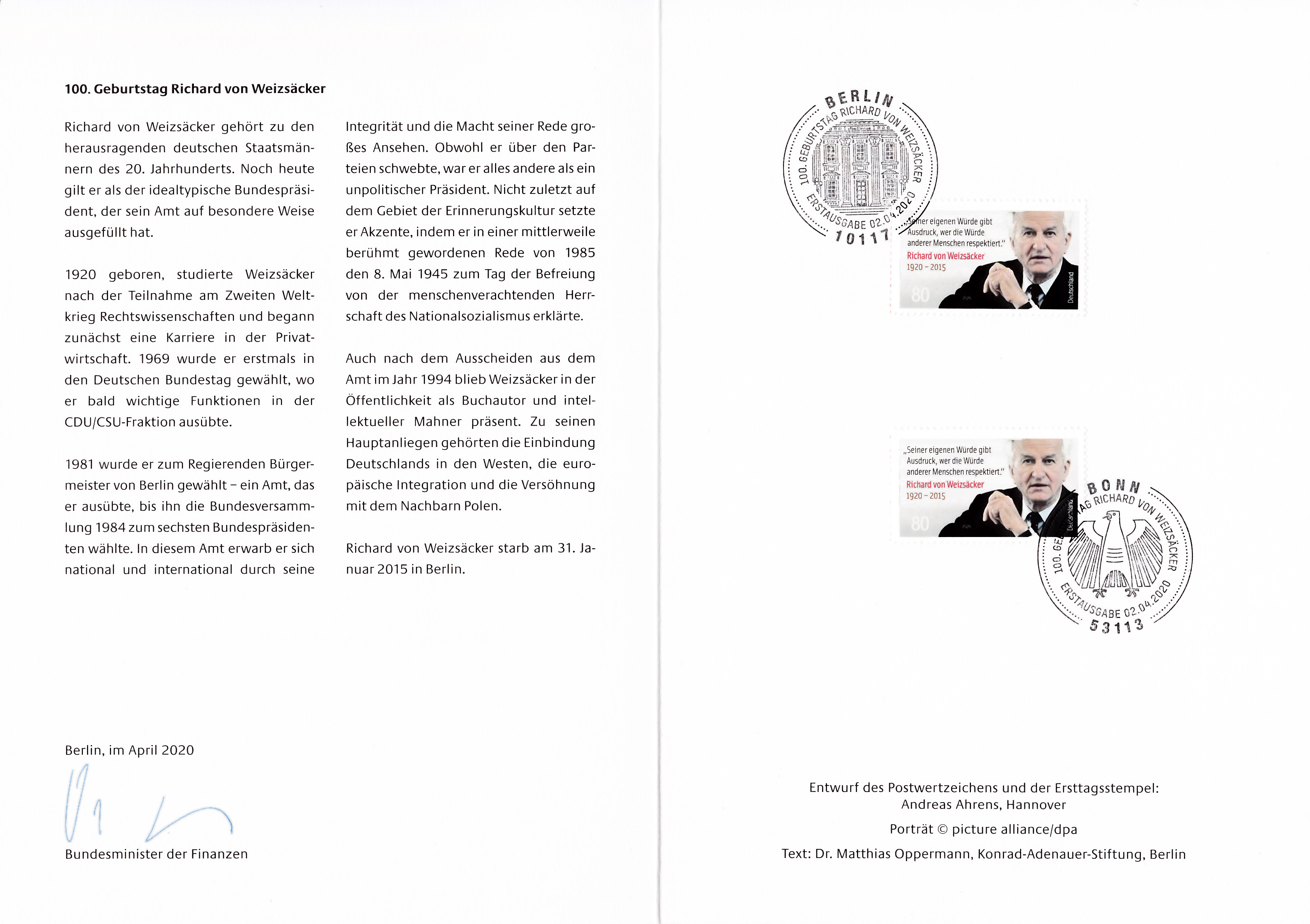 Ministerkarte des Finanzministers mit zwei Marken zum 100. Geburtstag von Richard von Weizsäcker (MiNr 3539) und den beiden Ersttagsonderstempel Bonn und Berlin.