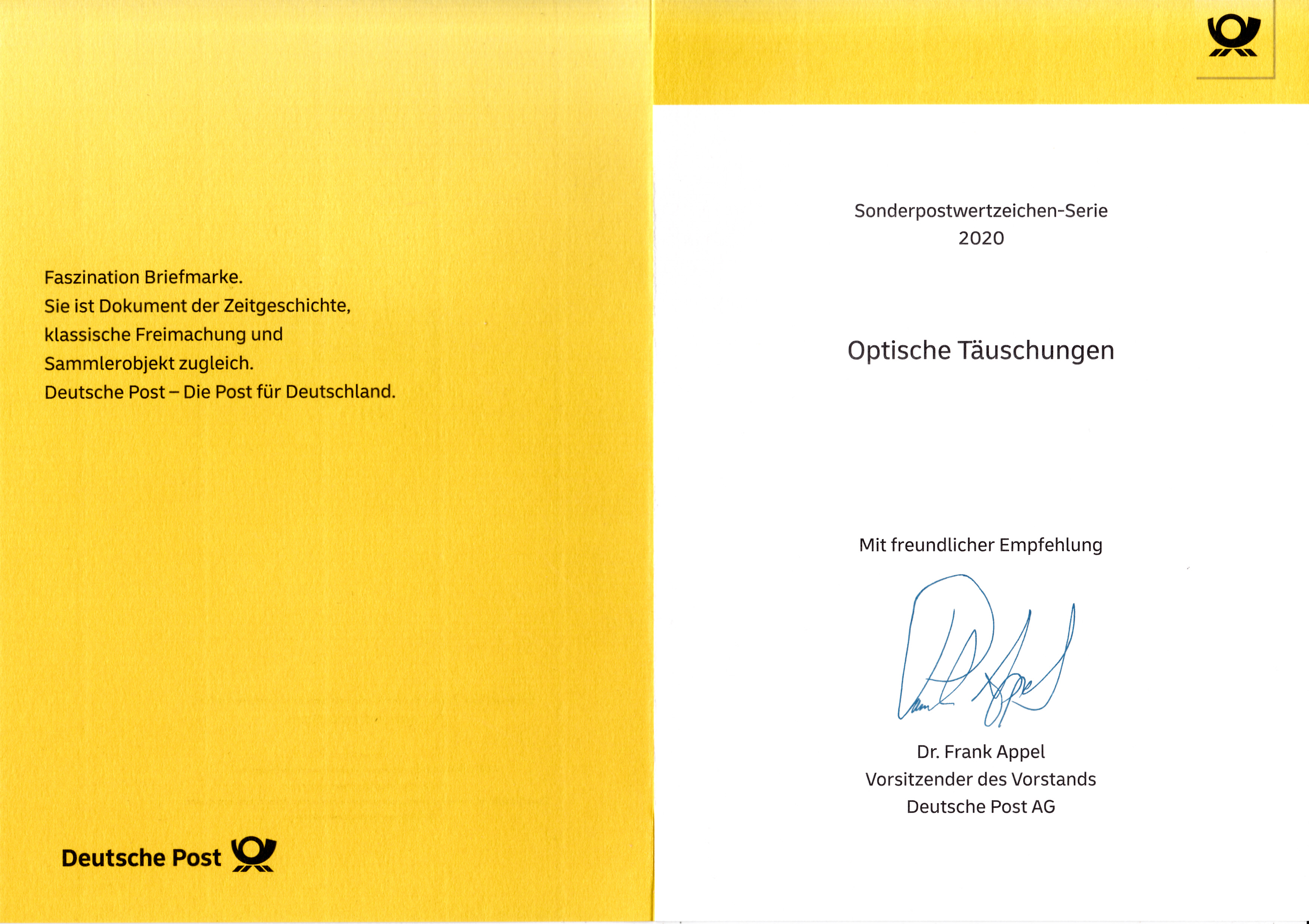 Klappkarte des Vorstandsvorsitzenden der Deutschen Post AG mit den zwei Marken der Serie "Optische Täuschungen" mit den Motiven "Zwei Grautöne?" und "Freies Quadrat?" (MiNr 3536/37) und dem Ersttagsonderstempel Bonn.