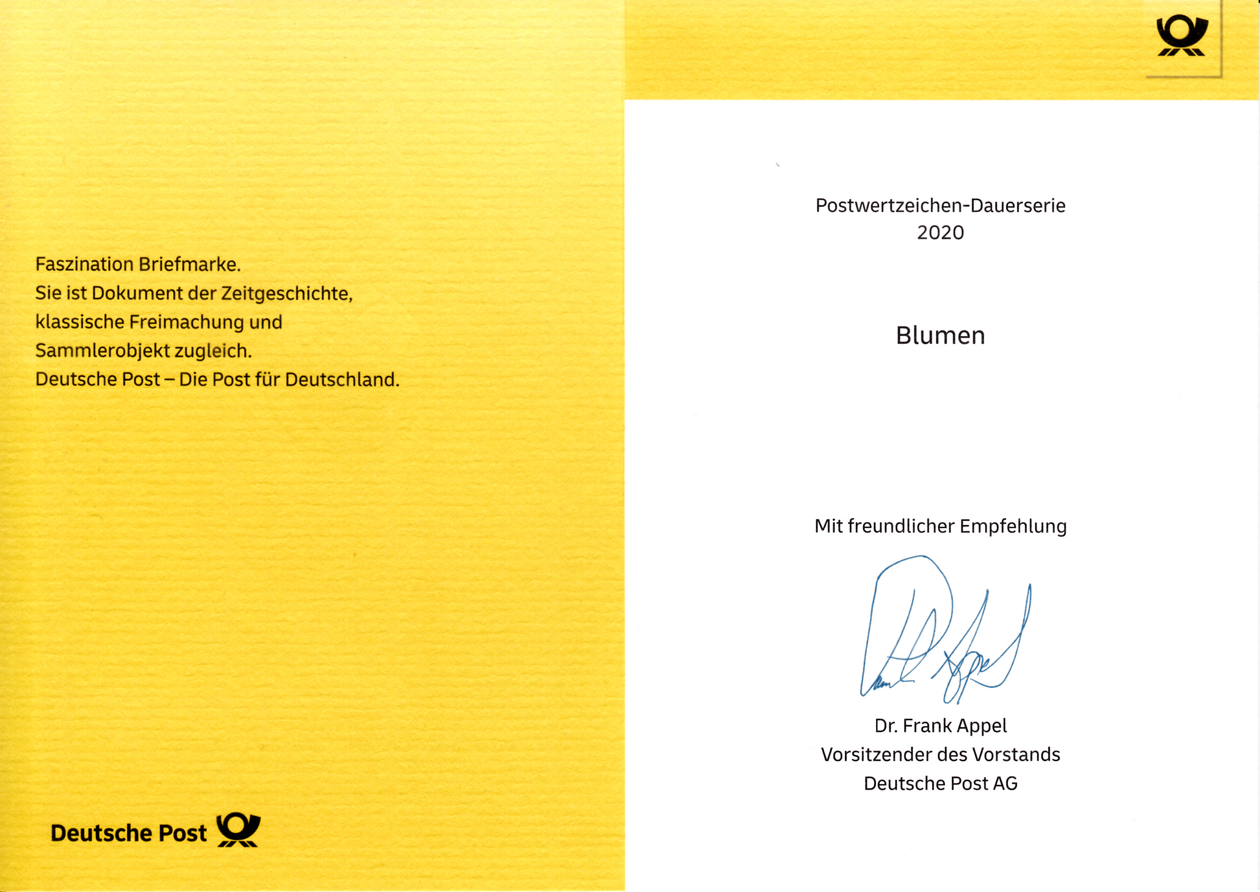 Klappkarte des Vorstandsvorsitzenden der Deutschen Post AG mit der Marke der Dauerserie "Blumen" zu 50 Cent mit dem Motiv "Zinnie (Zinnia elegans)" (MiNr 3535) und dem Ersttagsonderstempel Bonn.