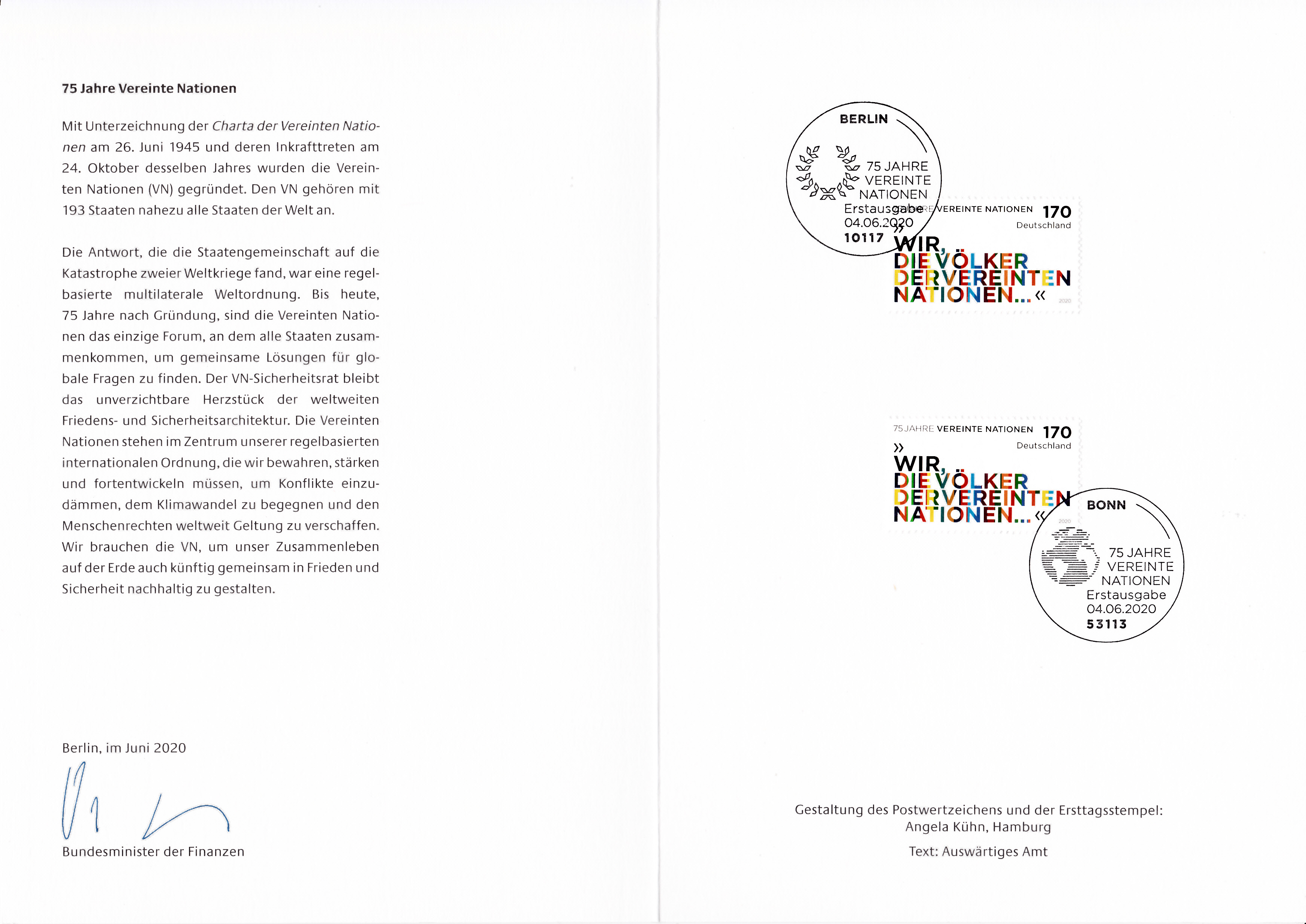 Ministerkarte des Finanzministers mit zwei Marken zum Jubiläum "75 Jahre Vereinte Nationen" (MiNr 3549) und den beiden Ersttagsonderstempel Bonn und Berlin.