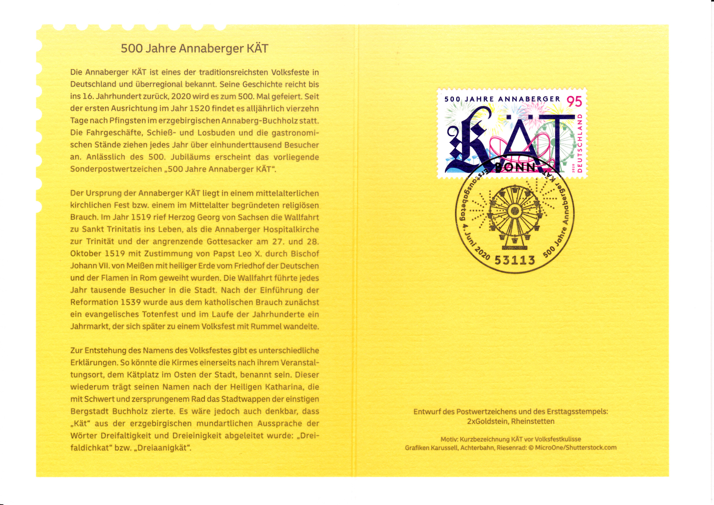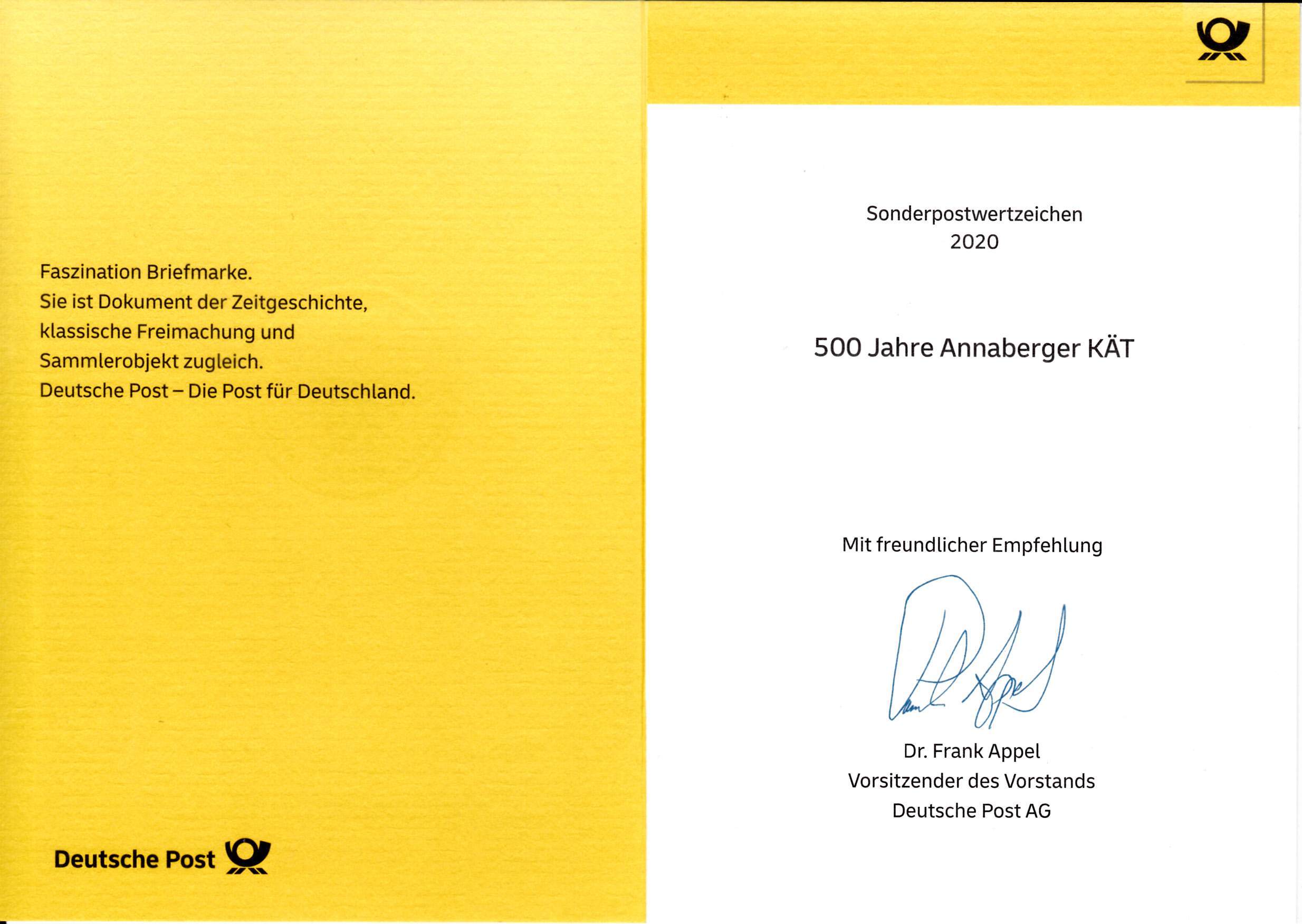 Klappkarte des Vorstandsvorsitzenden der Deutschen Post AG mit einer Marke zum Jubiläum "500 Jahre Volksfest Annaberger Kät" (MiNr 3547) und dem Ersttagsonderstempel Bonn.