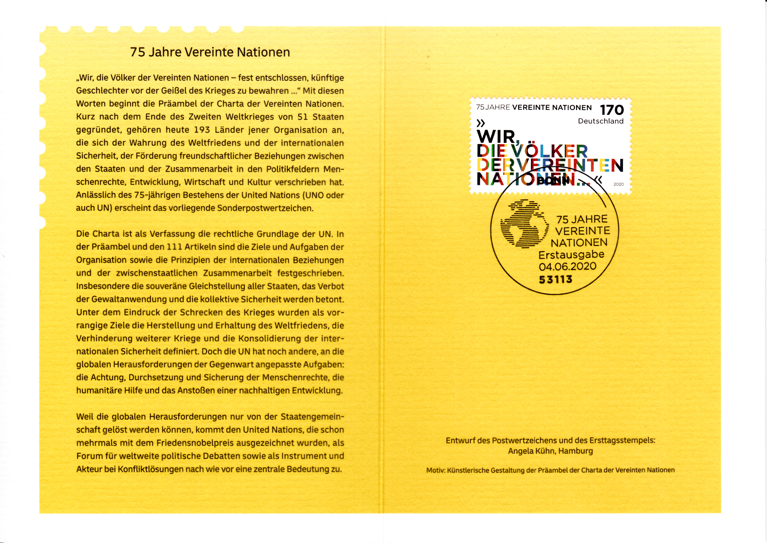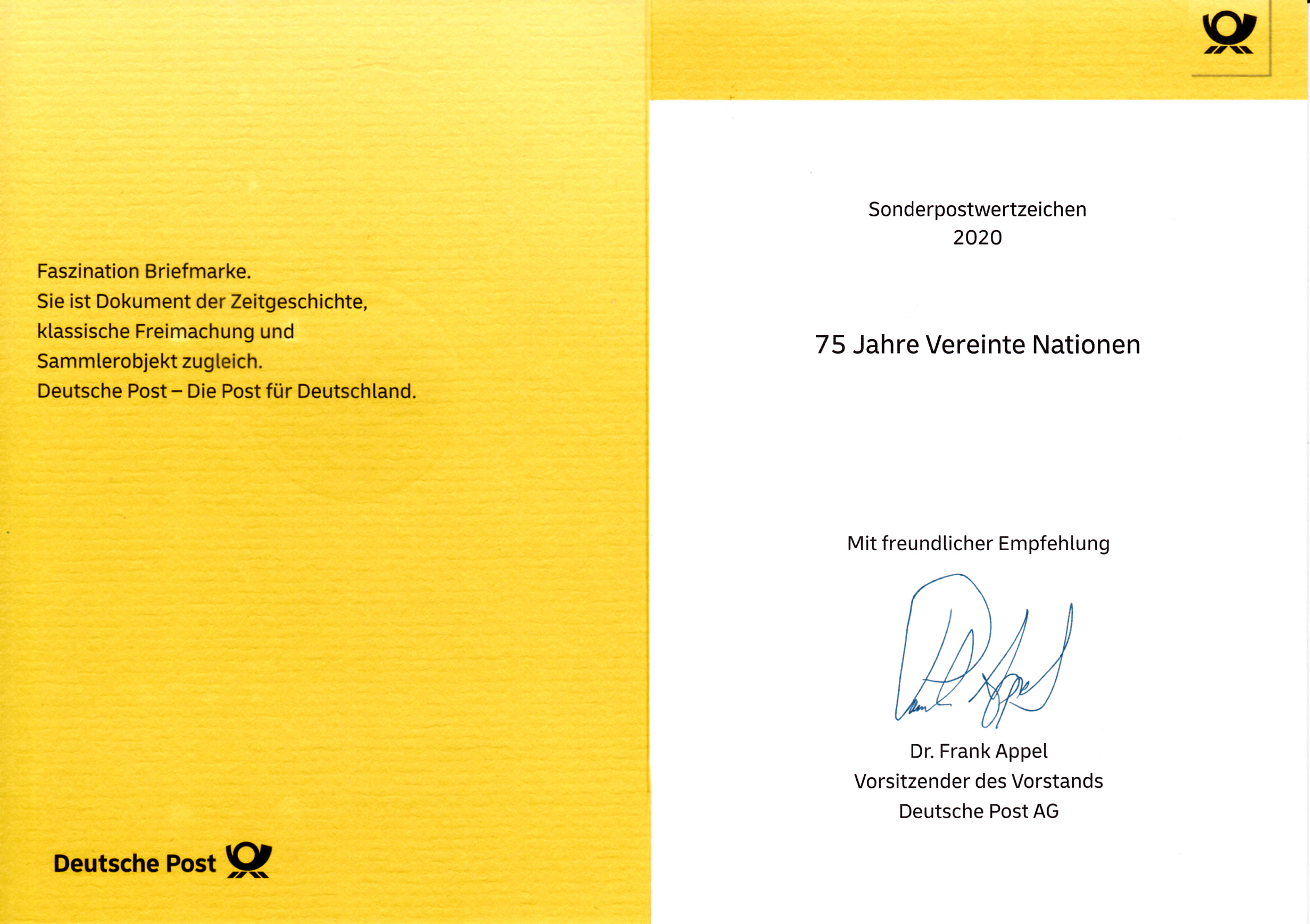 Klappkarte des Vorstandsvorsitzenden der Deutschen Post AG mit einer Marke zum Jubiläum "75 Jahre Vereinte Nationen" (MiNr 3549) und dem Ersttagsonderstempel Bonn.