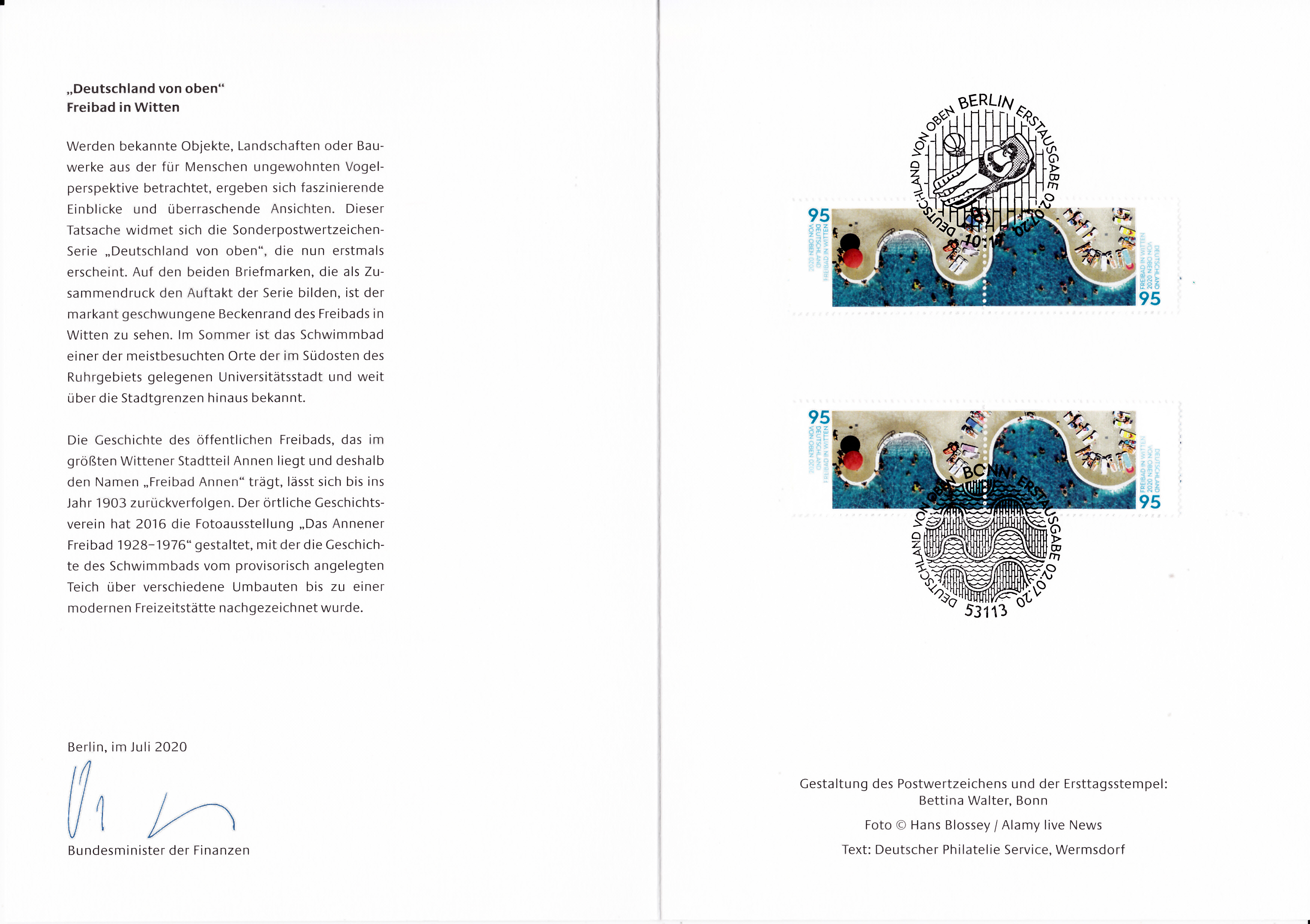 Im Juli 2020 gab es folgende Ministerkarten: Ministerkarte des Finanzministers mit zwei Zusammendrucke aus der Serie "Deutschland von oben" mit dem Motiv "Freibad in Witten" (MiNr 3550/51) und den beiden Ersttagsonderstempel Bonn und Berlin.