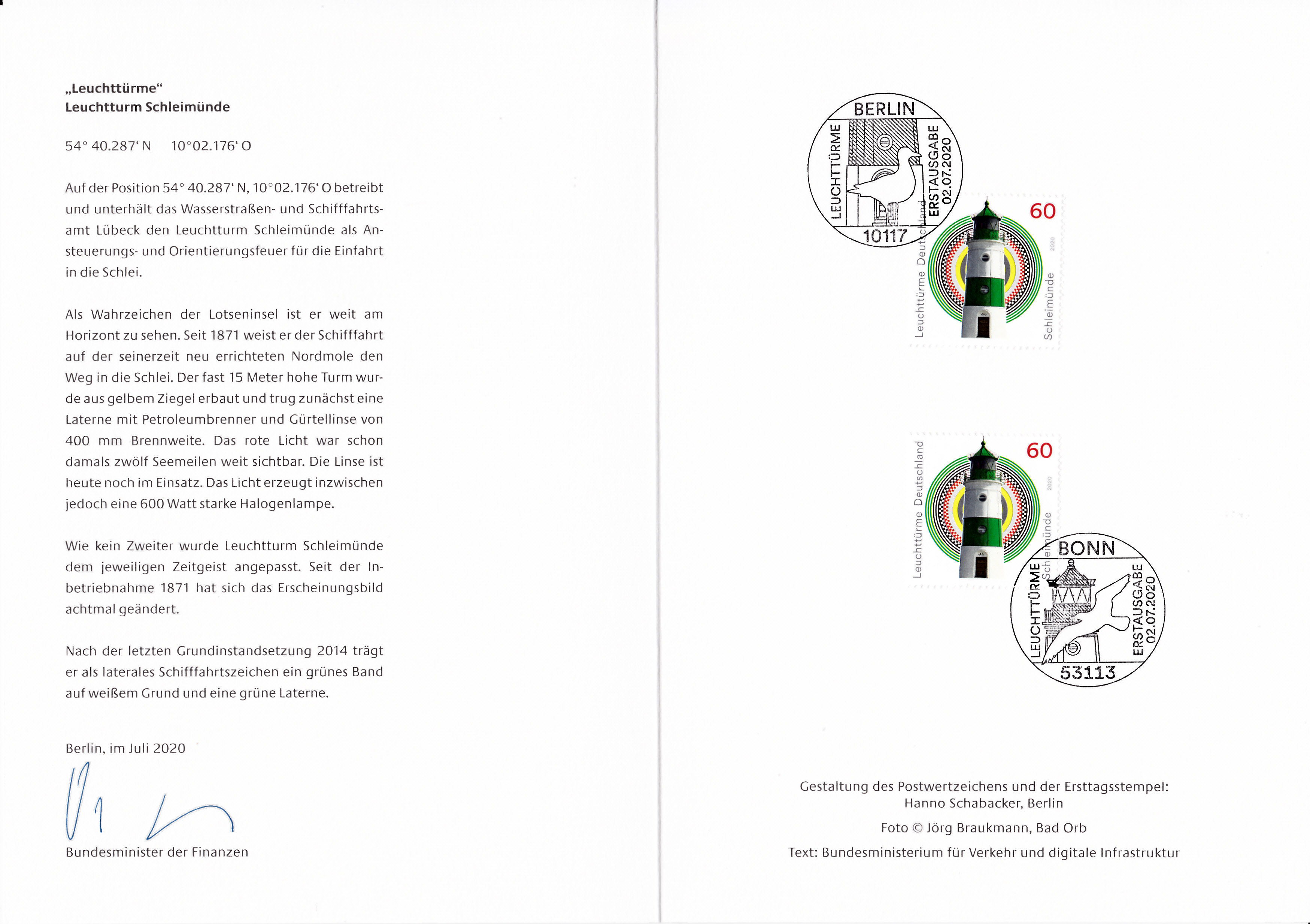 Ministerkarte des Finanzministers mit zwei Marken aus der Serie "Leuchttürme" mit dem Motiv "Leuchtturm Schleimünde" (MiNr 3552) und den beiden Ersttagsonderstempel Bonn und Berlin.