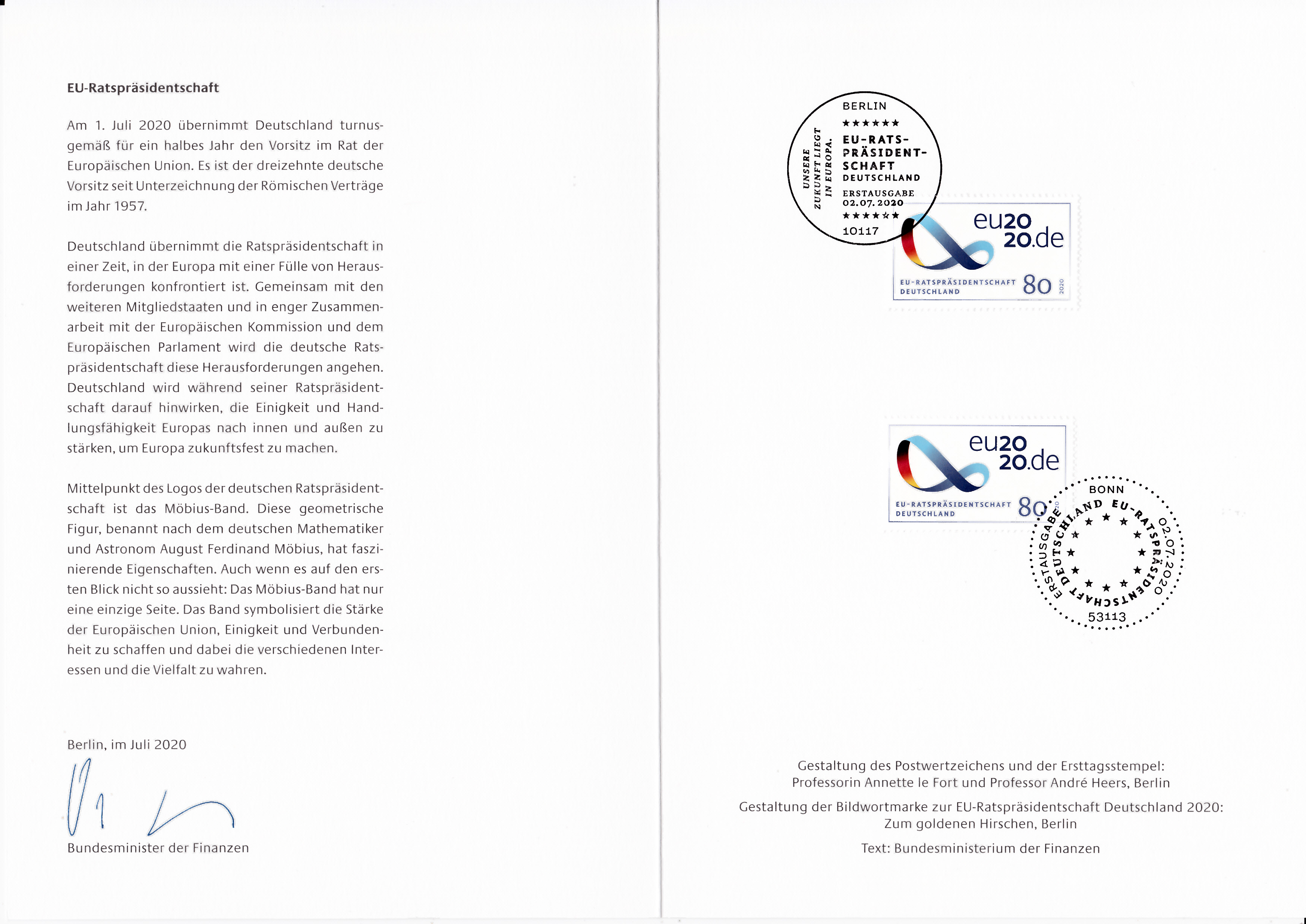 Ministerkarte des Finanzministers mit zwei Marken zum Vorsitz Deutschlands im Rat der Europäischen Union (MiNr 3554) und den beiden Ersttagsonderstempel Bonn und Berlin.