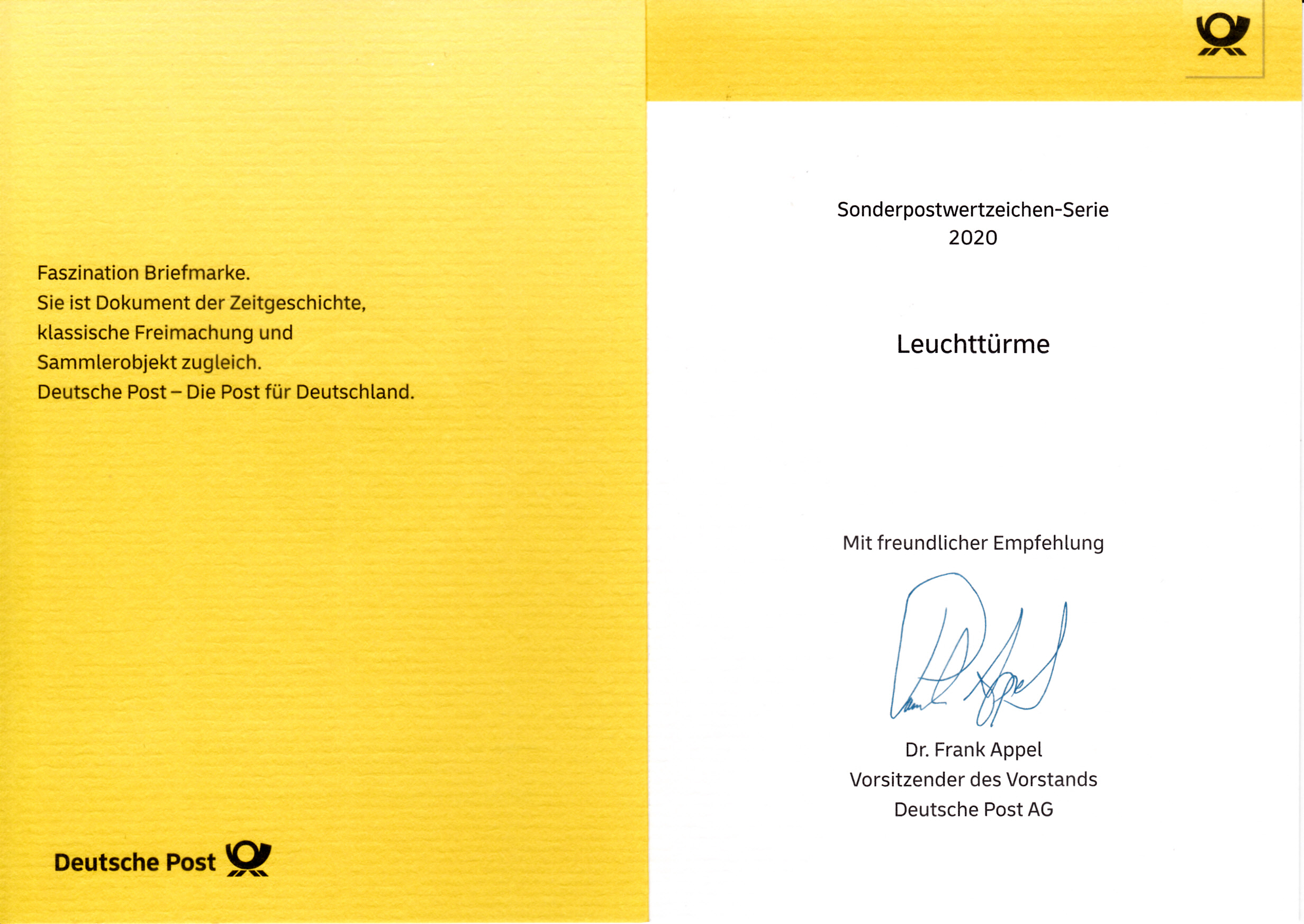 Klappkarte des Vorstandsvorsitzenden der Deutschen Post AG mit einer Marke aus der Serie "Leuchttürme" mit dem Motiv "Leuchtturm Schleimünde" (MiNr 3552) und dem Ersttagsonderstempel Bonn.