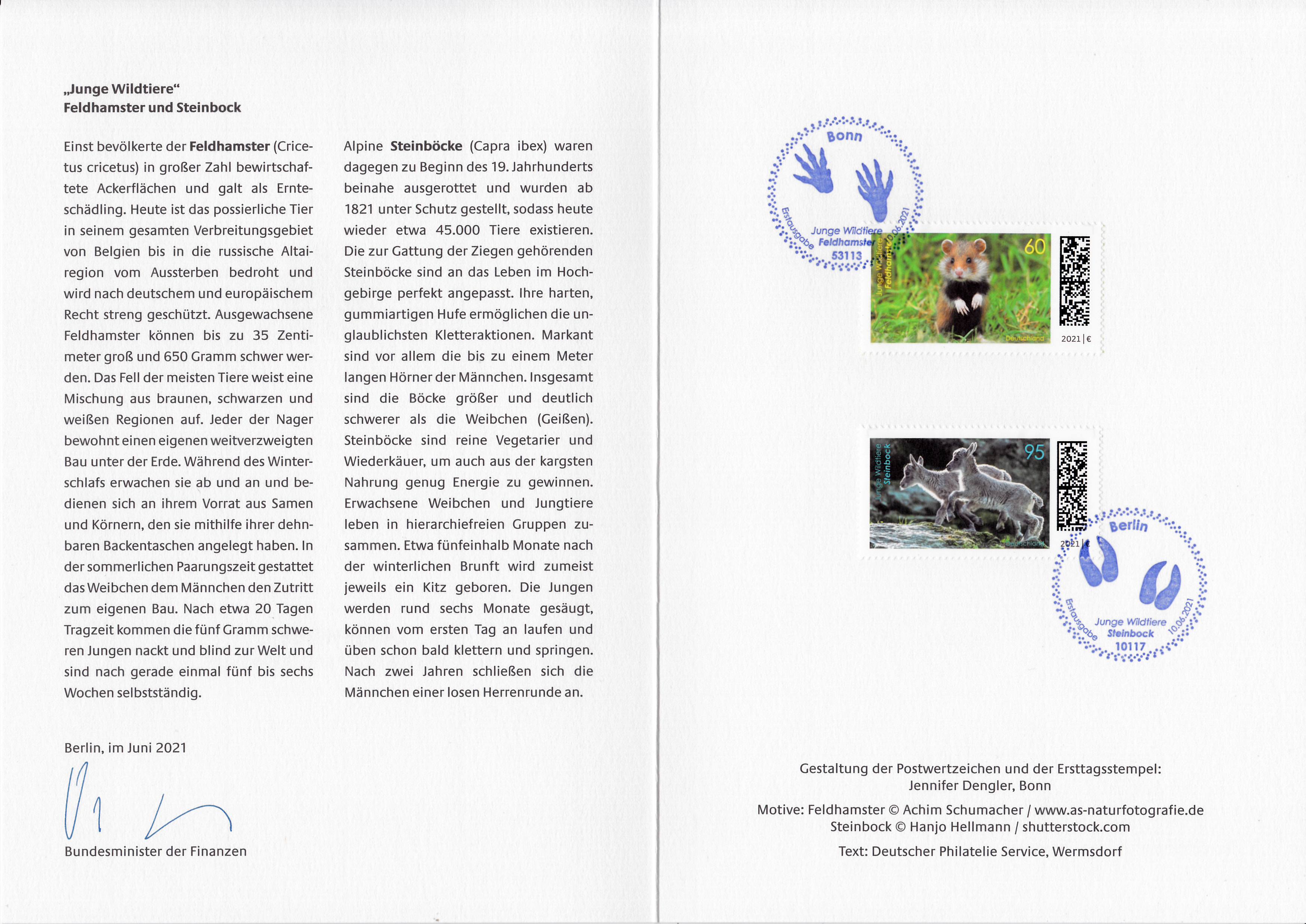 Ministerkarte des Finanzministers mit je einer Marke der Serie "Tierbabys" (MiNr 3608/3609) mit Motiven "Feldhamster (Cricetus cricetus)" und "Alpensteinbock (Capra ibex)". Die Marken sind mit den jeweils passenden Ersttagsonderstempel Berlin und dem Ersttagsonderstempel Bonn gestempelt.