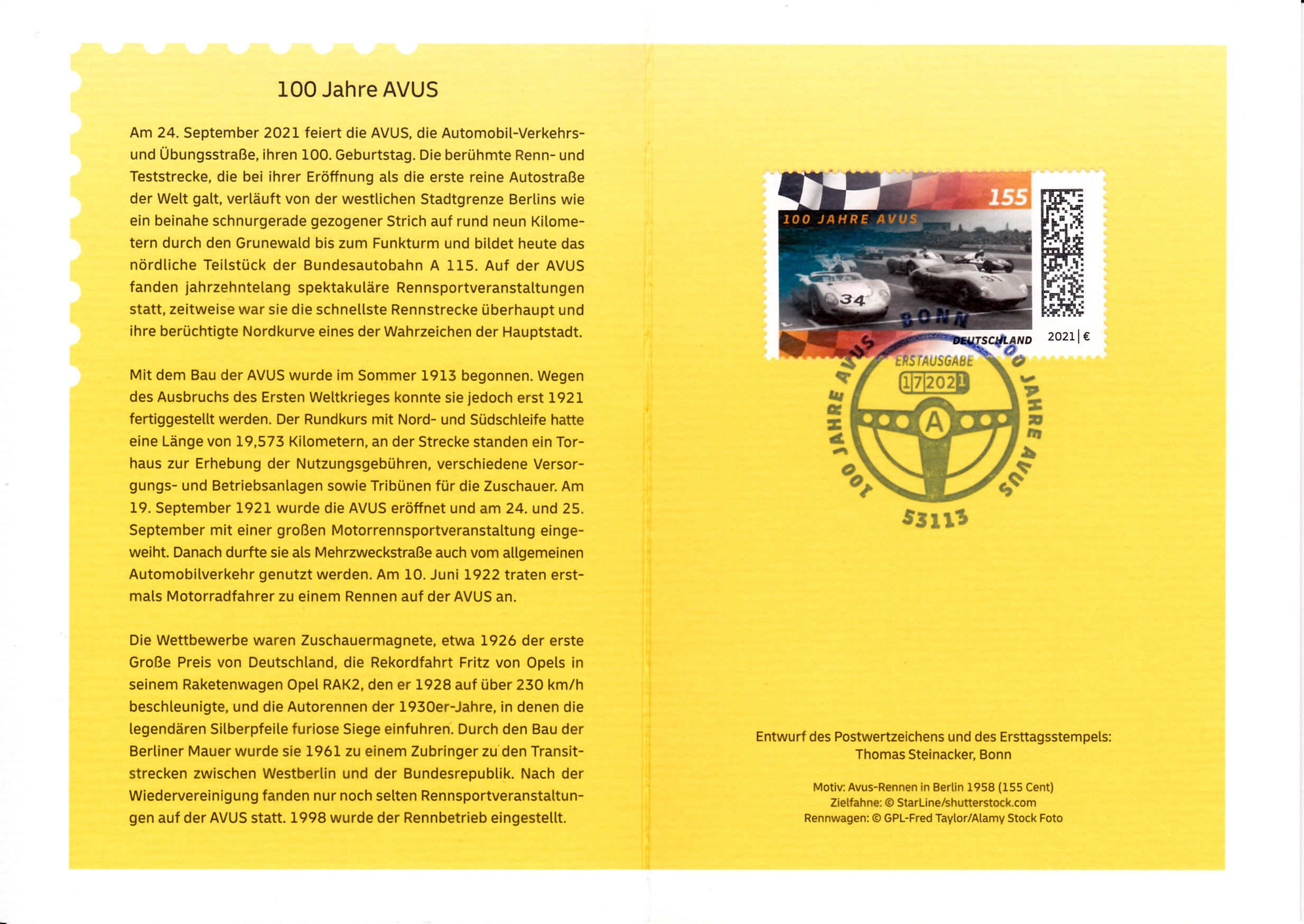 Klappkarte des Vorstandsvorsitzenden der Deutschen Post AG mit der Marke "100 Jahre Automobil-Verkehrs- und Übungsstraße AVUS" (MiNr 3616) und dem Ersttagsonderstempel Bonn.